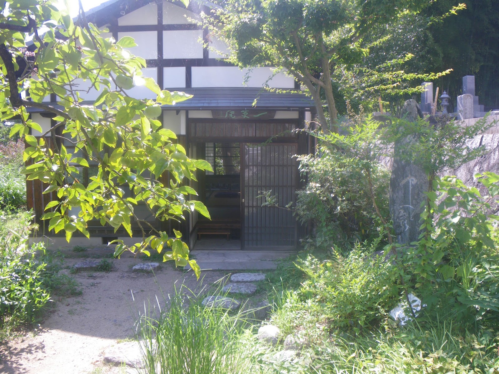 北にちょっと進み御幸寺の手前東側に「種田山頭火終焉の地 一草庵」の案内 があった。奥に一草庵があるが、その手前の整備された庭に新しく造られたような句碑ふたつ。庵の庭に自然石の句碑二基が立つ。