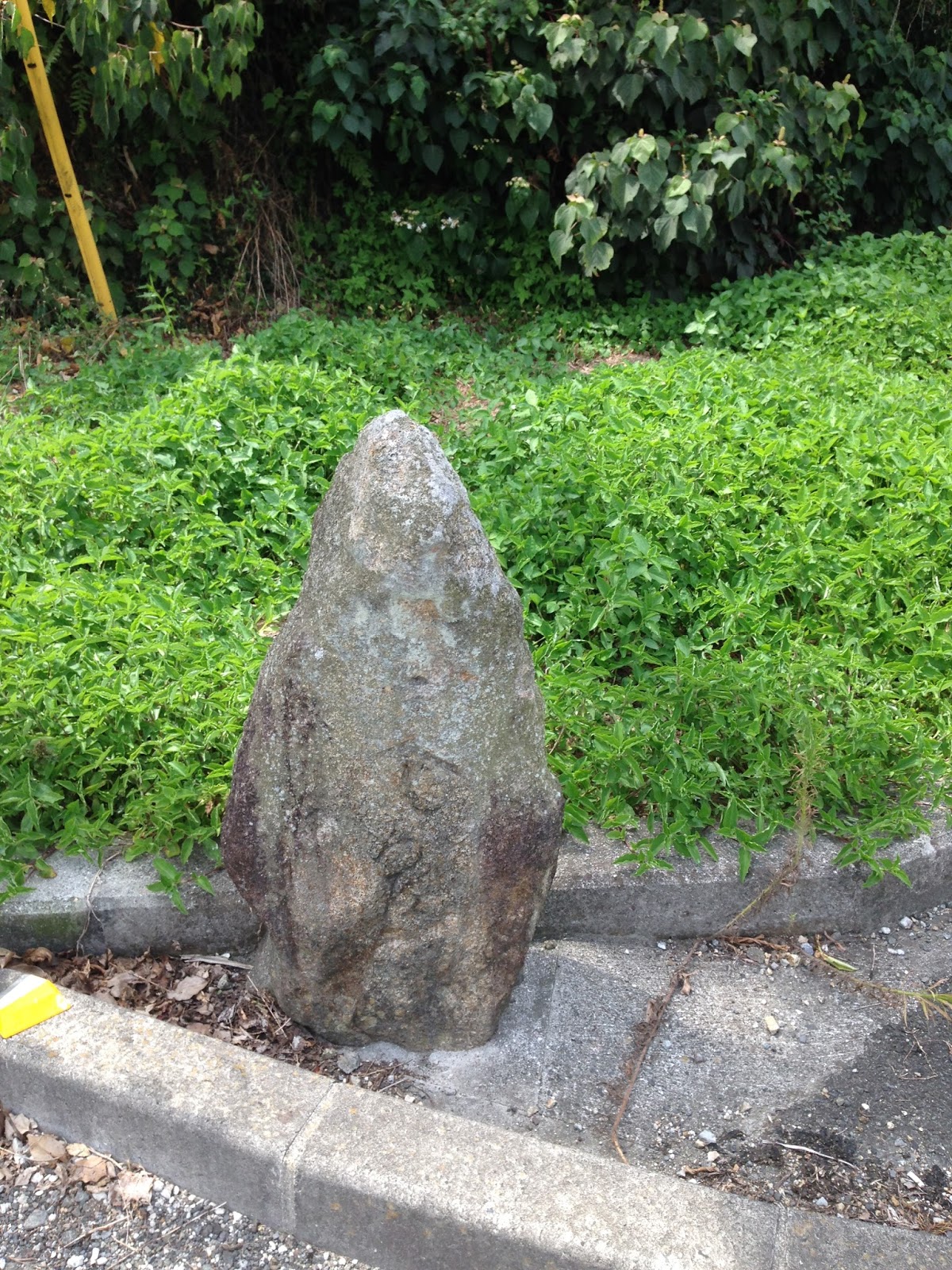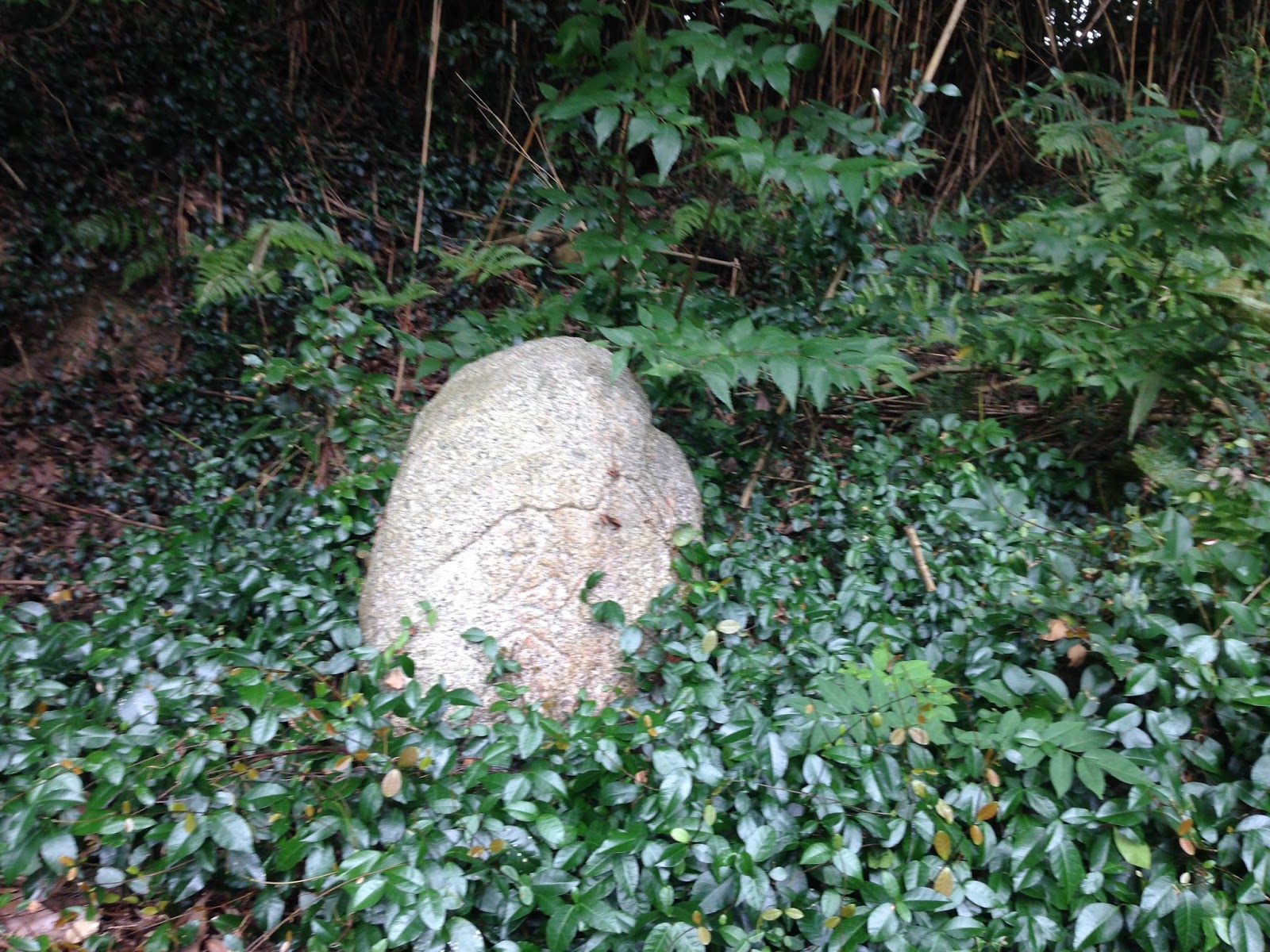 祠の右手に自然石に少し人の手を加えたような角ばった石碑が立つ。「青・・・」」とか「へんろ」らしき文字が刻まれていた。