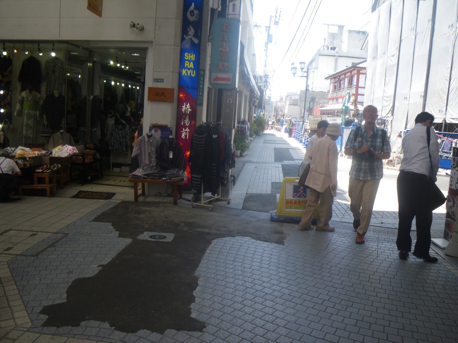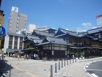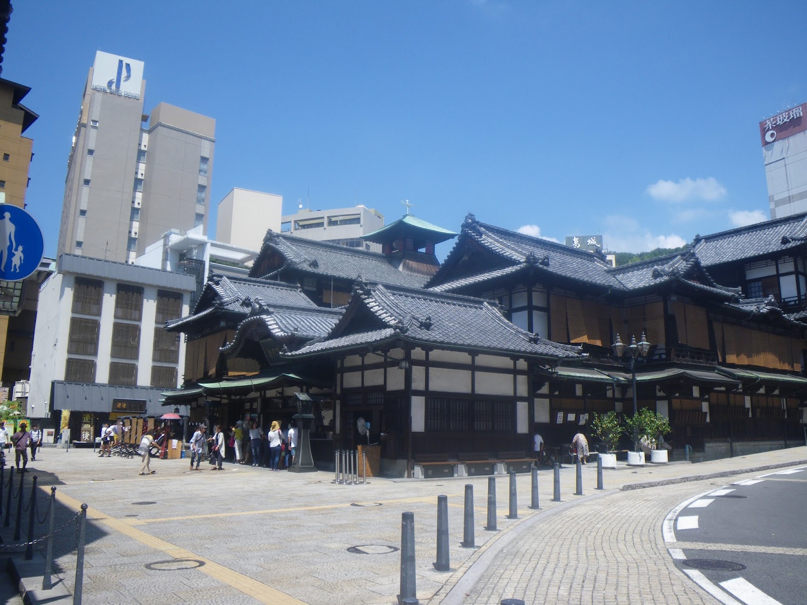 宝厳寺から伊佐爾波神社石段参道口まで戻り、坂道を下り御手洗橋まで進む。そこを右に折れ、道後温泉本館脇に出る。前述、旧県道を進む遍路道もここに出る。