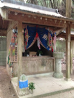 なんとなく悲しい物語の多い義安寺を離れ、県道を少し西に進み、地蔵堂のあるT字路を右折し坂を上ると伊佐爾波神社参道口に。右手は拝殿に上る石段、左手は西に下る参道となっている。