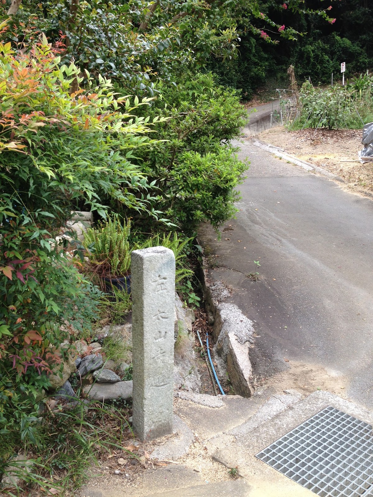 この記事に従い松山市立北中学前を通り抜け、山裾の道に突き当たると、記事の通り自然石の道標があった。その先、記事では「大将軍神社境内や小公園の縁を行き、北側の山麓の一段高い所を曲がりくねって上下する山道を行く」とあるが、地図には山道が描かれておらず六十六部山裾の道を進むと「遍路道」の案内があり、左に分岐する細い道があった。