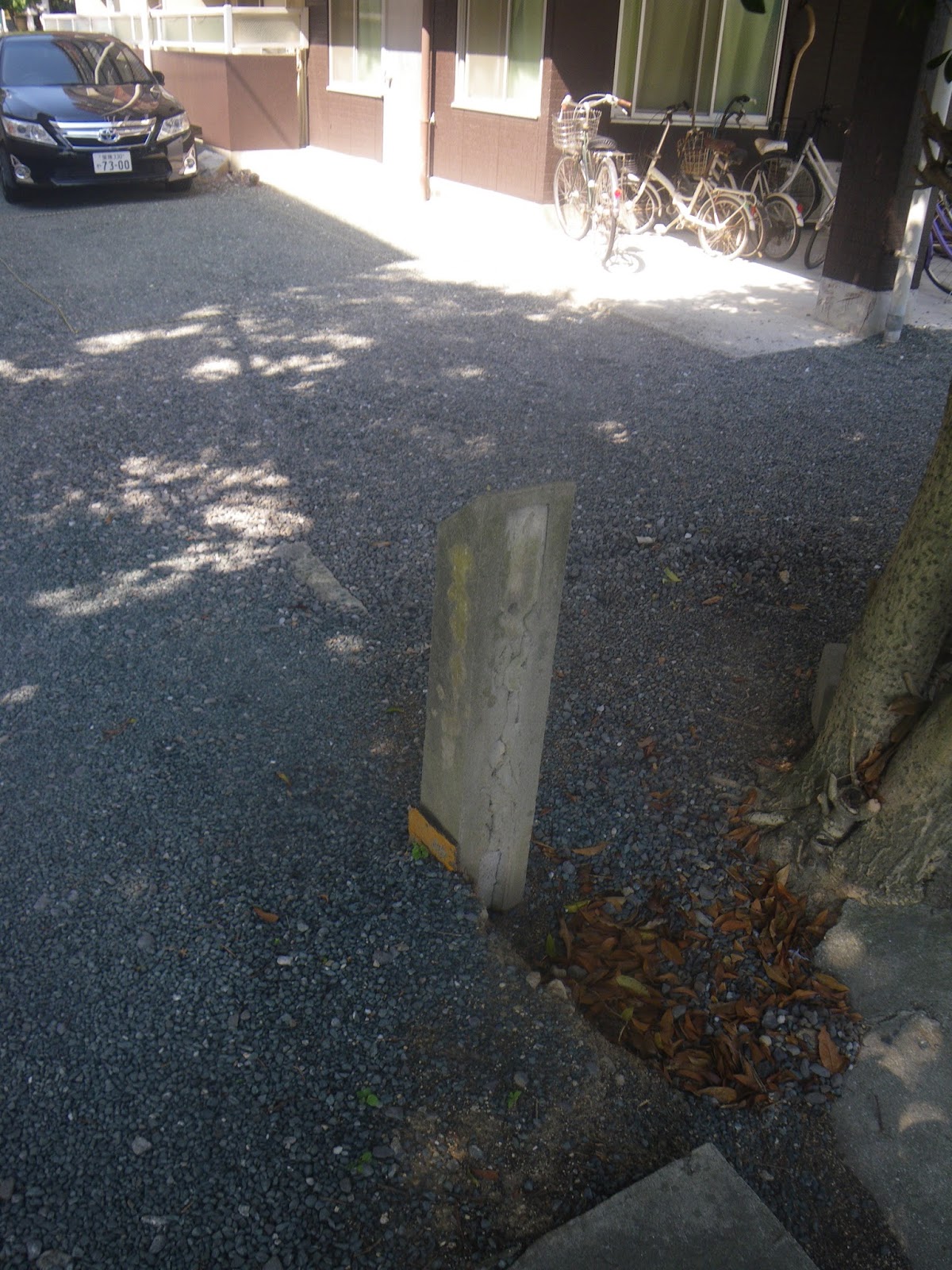 参道を南に下り、県道187号沿いに立つ鳥居の県道南西に茂兵衛道標があった。上にメモした、明治28年(1895)ころ道後駅から、城北に向かい走っていた軌道車の線路沿いを、この樋又の護国神社鳥居前に立つ茂兵衛道標(私注;後述)につながり、そのあと南海放送会館前(私注;現在の本町会館と異なり、昭和39年に道後樋又に建設された南海放送会館のことだろう)から大川沿いの本道に出る、いわゆる脇道の遍路街道に建っていた、ということだろう。