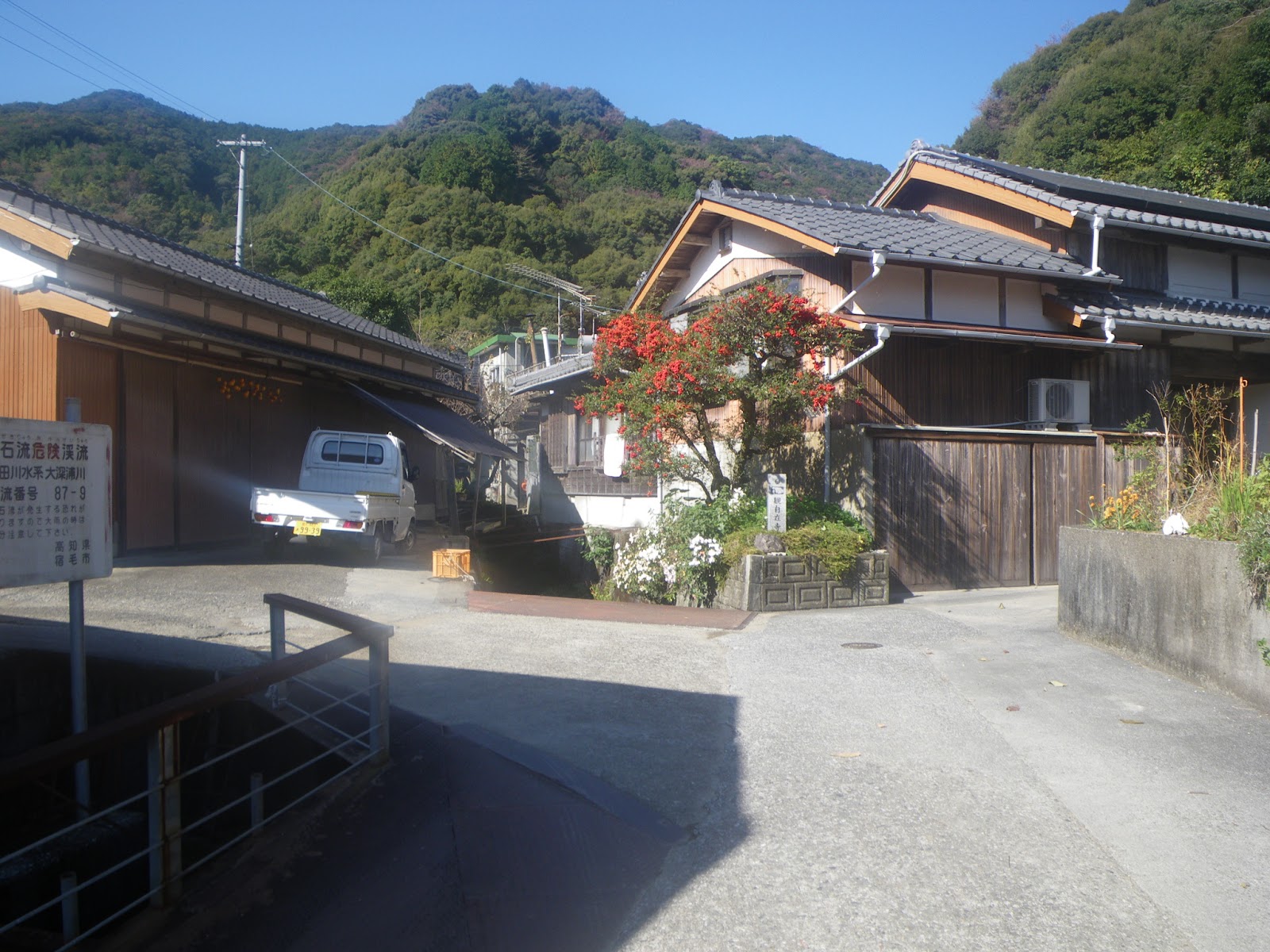 道を進むと錦の集落に。車デポ地からおおよそ20分弱といった距離。歩いているときは山間の集落かとも思ったのだが、地図で見ると松田川近くまで落ちる支尾根に挟まれ、前方が松田川河口に向かって開けたところではあった。