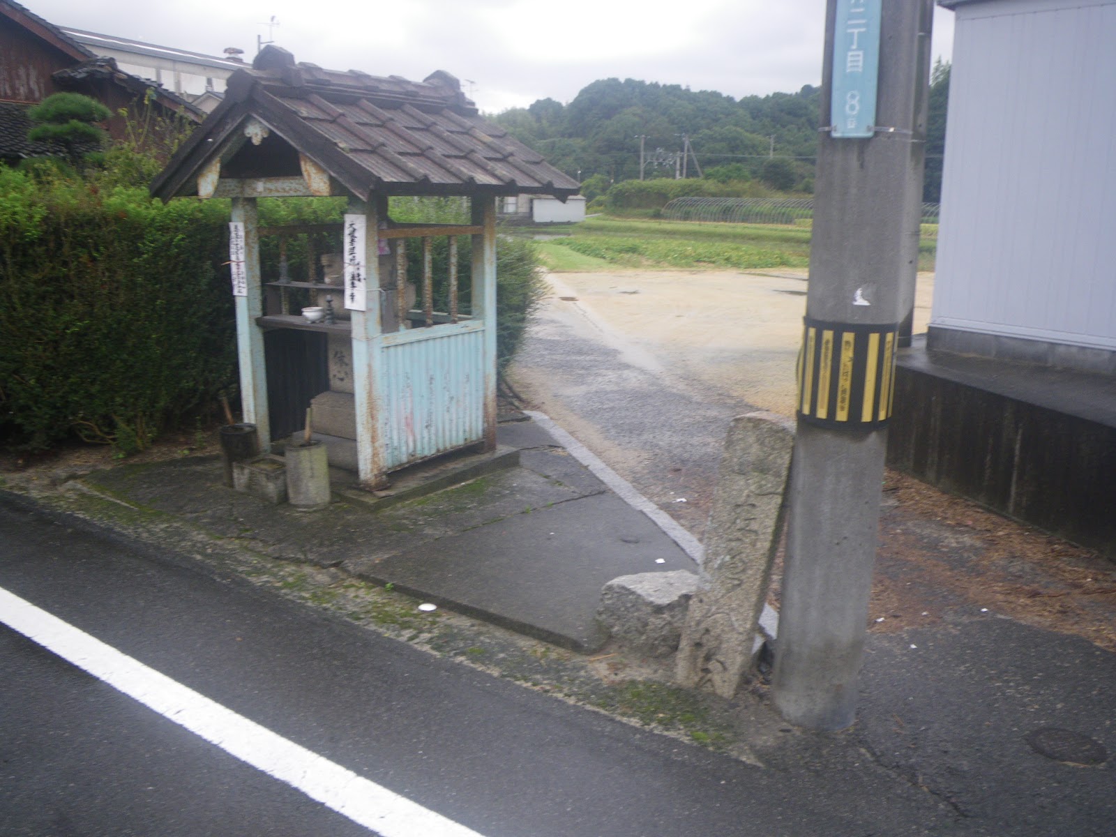 道を進むと小川に架かる橋の手前に地蔵道標が立つ。「左 遍ろみち」と刻まれている。「えひめの記憶」には「遍路道は、地蔵道標で左折しJR予讃線と並行する小道を小川(用水路)に沿って南東へ進む」の記述とともに、「県道156号ができるのは昭和33年だが、それ以前のもう一つの遍路道は、県道に沿って南東に約300m進み、商店で右折して100mほど西に行くと、JR予讃線と並行して南東へ進む遍路道と合流した」とある。