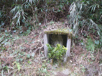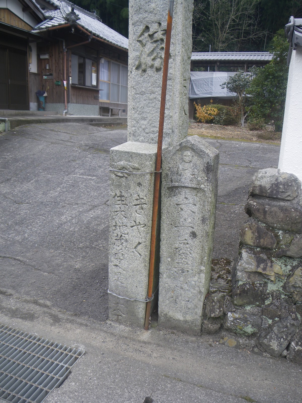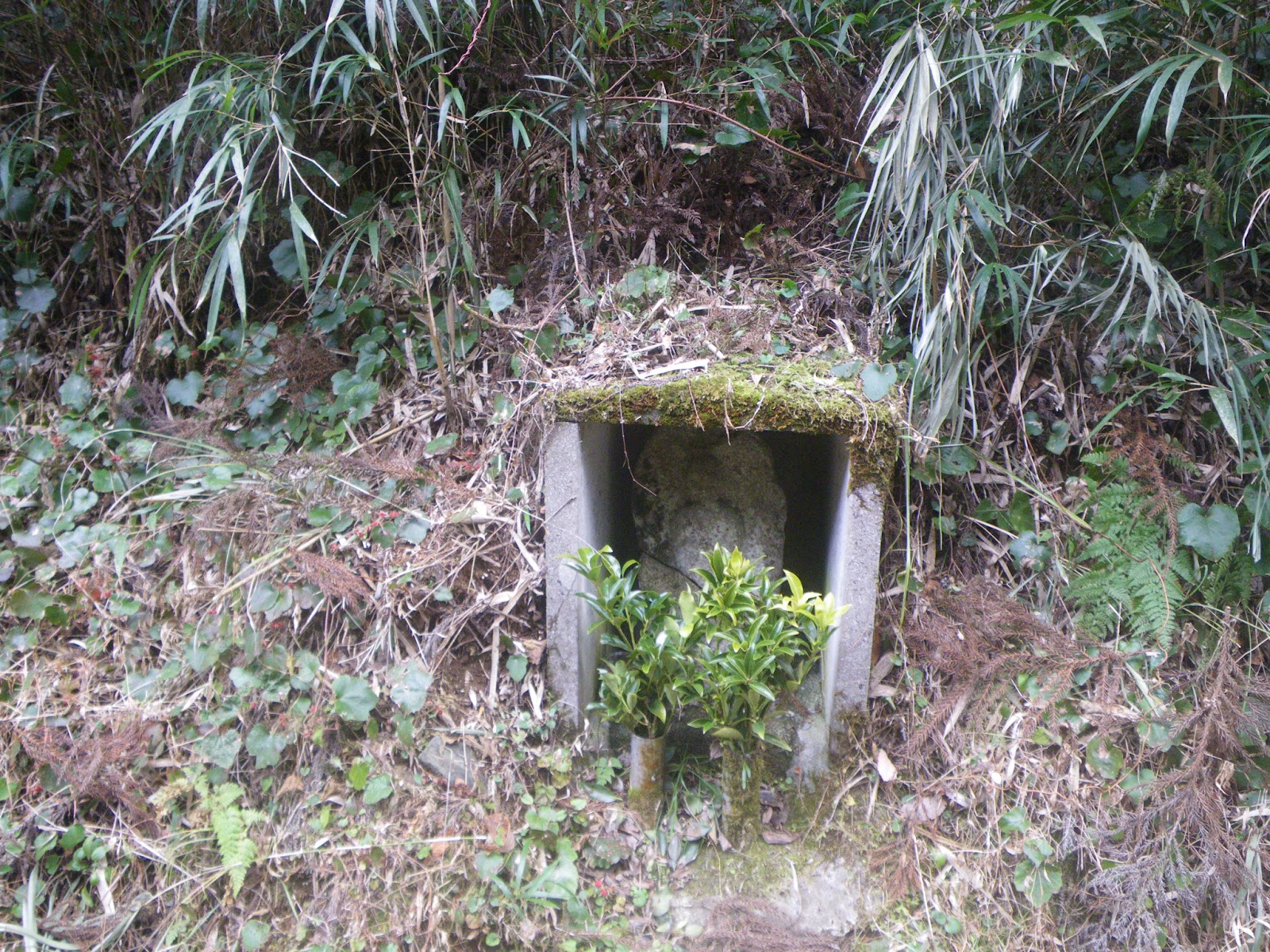 しばらく行くと三差路に、大江(大郷)村が建てた地蔵道標と「横峯迄五十丁」と刻まれた徳右衛門道標が立っている。このあたりには馬返(うまがえし)という字名(あざめい)が残っているが、杉林の中の隘路(あいろ)は名前の由来が実感できるほど険しい山道である。道標の左の道を進むと、「三十九丁」「三十八丁」「三十七丁」の地蔵丁石と明治34年(1901)に建てられた供養塔らしい石造物がある。そこから100mほど進むと杉林は終わり視界が開けてくる。しきみ(花柴)畑の右を通過して30mほど下ると、県道147号と再び合流する」とある。記事に遍路道と記されている以上、とりあえず歩いてみようと。が、この記事では今一つアプローチ点がはっきりしない。それらしき辺りで農作業をされていた地元の方に尋ねると、カーブ手前の赤い屋根のある建物の先から入り込むとのこと。が、誰も歩いておらず道も消え、藪を進むことになるから止めたほうがいいよ、と。