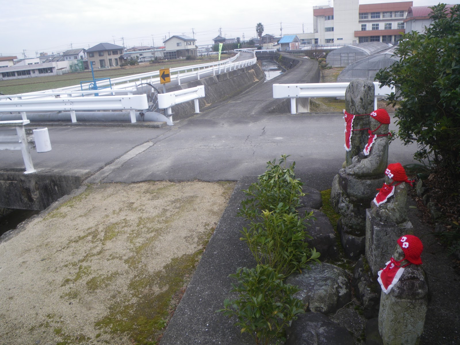 「中山川上手から幅約2mの農道を南東に500mほど進み、大井出川に架かる橋を渡った右手に、地蔵・橋供養塔など4基の石造物がある(「えひめの記憶」)」との記事を頼りに中山川右岸から成りゆきで進むと大井出川に架かる小橋脇に4基の石造物があった。