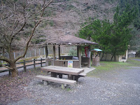 正面に妙之谷川の砂防ダムが見えるところで右に曲がると四阿があり県道はここで終る。山側に横峰寺への登山口がある。「横峰寺 2.2km」の木標が立つが、訪れたときは,