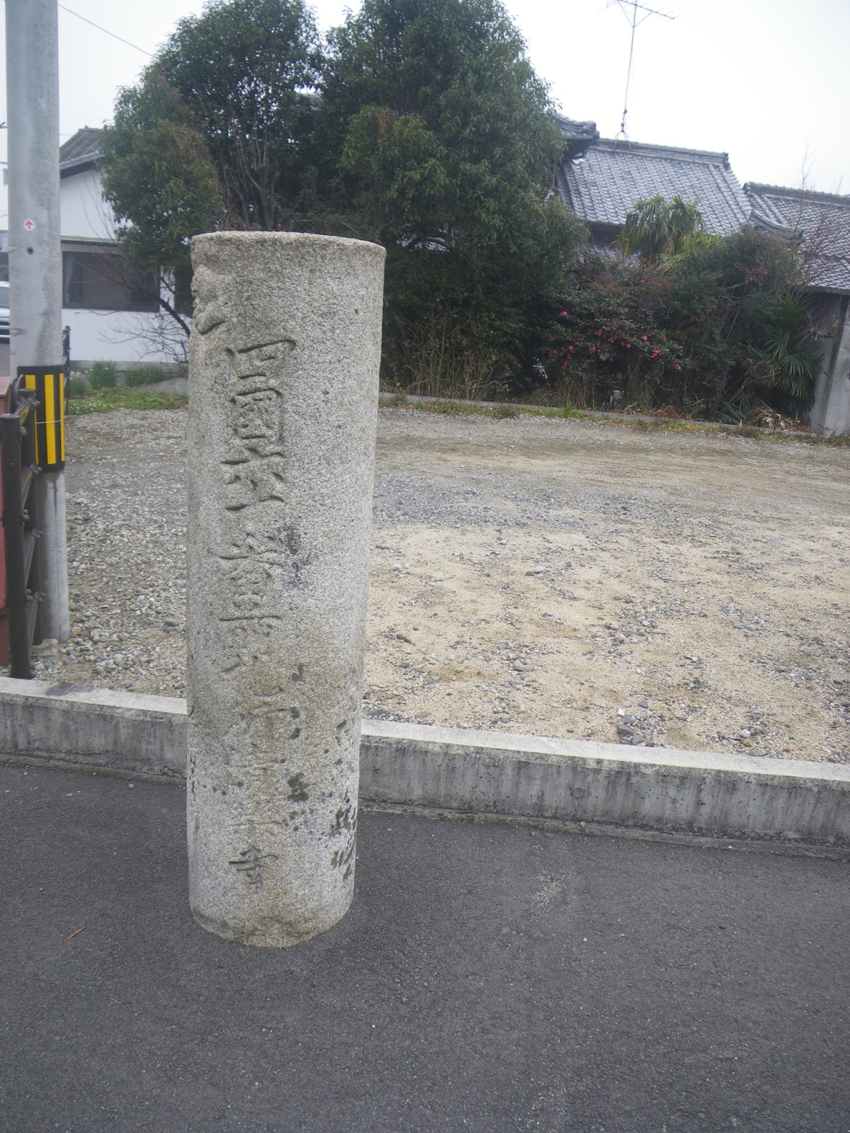 T字路を左折するとすぐ南に折れるT字路があり、その角の駐車場脇に道標がある。「えひめの記憶」には、「仏心寺を西に見ながら直進し、約200m進んで三差路を左折するとすぐ、(なんか)公民館西の三差路に至り、三差路東の民家のブロック塀に隣接して、大峯寺と香園寺への道を示した茂兵衛道標がある。このあたりが岡村の北端である」とある。公民館もブロック塀も無いようだが、この駐車場脇の道標が記事にある茂兵衛道標かと思う。摩耗し文字は読めないが、手印と共に「大峯寺」と「香園寺」の文字が刻まれる、と。