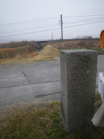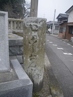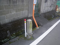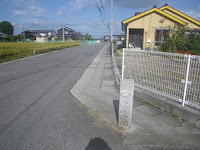 道祖神から500mほど進むと、右に少し細くなった道が分かれる。遍路道はこの右に入る道を進む。途中、地蔵堂などを見遣りながら進むと{闇岡(くらみ)神社前(石田本郷601-2)の道路沿いに道標がある(えひめの記憶)」とする。当日は、どうしたことか見つけることができなかったのだが、Google Street Viewには民家ブロック塀の前に道標が立っている。どうして見つけられなかったのか、ちょっと混乱。