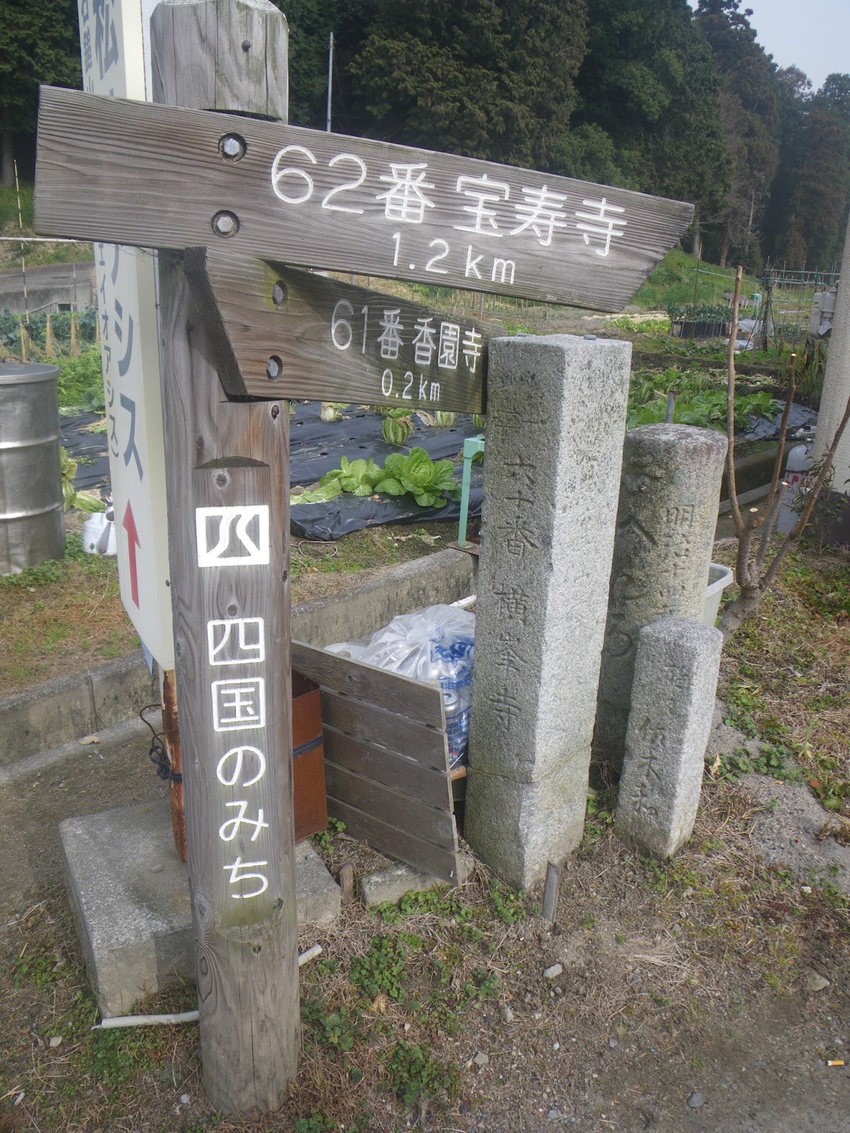参道へと左折するT字路、東西に走る道路の北側左手に3基の道標が並ぶ。手印と共に清楽寺への道を示した円柱の利平道標、「右へんろ」と刻まれた小さな道標、手印と共に「六十一番香園寺 六十二番寶壽寺」が刻まれた面と、矢印のようなマークと共に「六十番横峯寺」と刻まれた道標が、「61番香園寺 0,2km」「62番宝寿寺1.2km」と書書かれた「四国のみち」の木標脇に並ぶ。