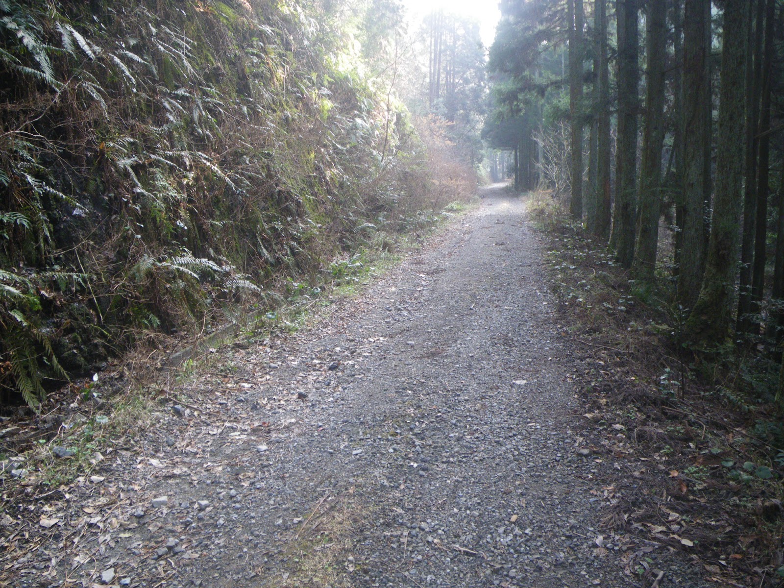 右の道を、左手に削り取られた採石場の山肌を見遣りながら進むとほどなく舗装が切れ、簡易舗装となり、それも切れると割と広い林道(本谷林道)を進む。「えひめの記憶」には舗装された道、と記されているが、簡易舗装も土砂で荒れたのか、小石の多い林道となってちる。