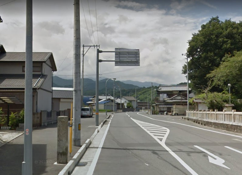 今治自動車道の高架下を進み、藤森荒魂神社を越えた先で遍路道は県道159号から分かれ右折する。「えひめの記憶」には、かつてこの角に道標や摂待所があったとのこと。