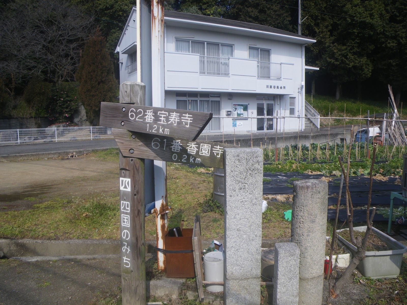 香園寺から六十一番札所・宝寿寺に向かう。香園寺の参道を北東に進み先般歩いた五差路に出る。車道の北側には3基の道標が立つ。手印と共に清楽寺への道を示した円柱の利平道標、「右へんろ」と刻まれた小さな道標、手印と共に「六十一番香園寺 六十二番寶壽寺」が刻まれた面と、矢印のようなマークと共に「六十番横峯寺」と刻まれた道標が、「61番香園寺 0,2km」「62番宝寿寺1.2km」と書かれた「四国のみち」の木標脇に並ぶ。