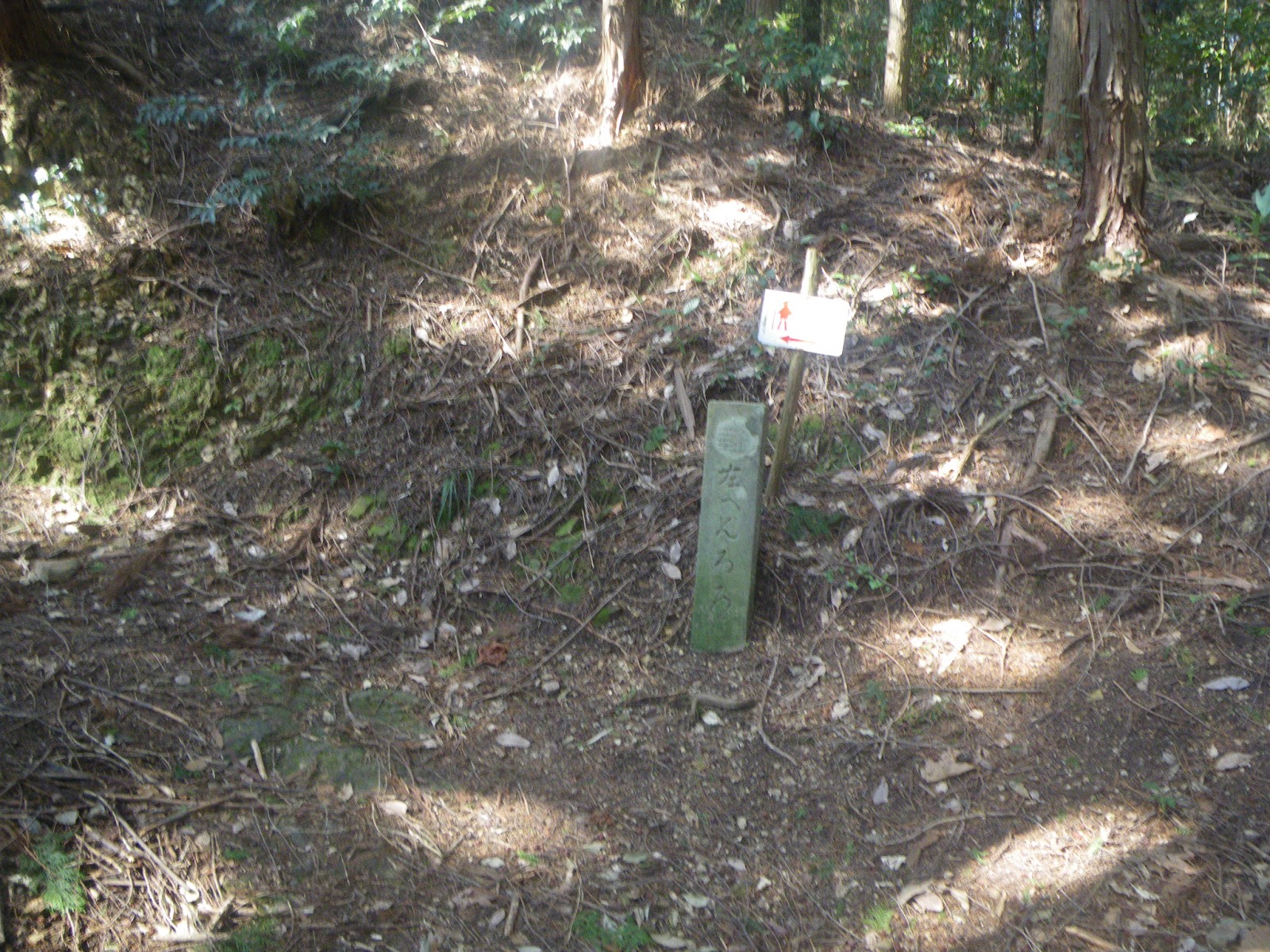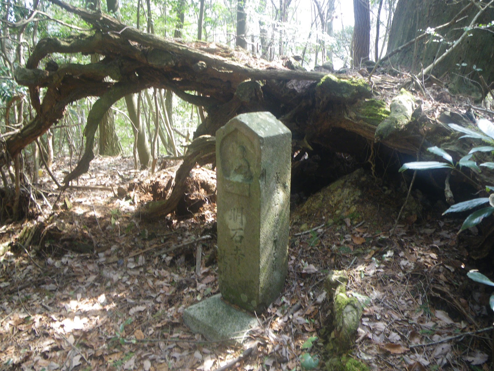 林道交差部から高度を120mほど下げたところ、倒れた松の下に道標がある。「明石寺 是ヨリ二里 寛政七」といった文字が刻まれると言う。