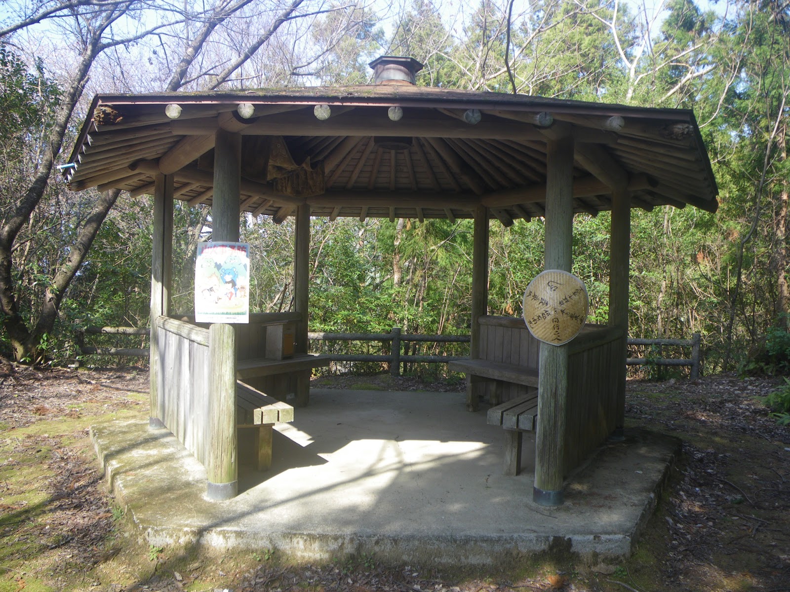 土径にはいるとすぐに休憩所〈9時36分〉がある。道を進むと「土砂崩れ 通行止め」の案内。どの程度の状態か確認に進む。