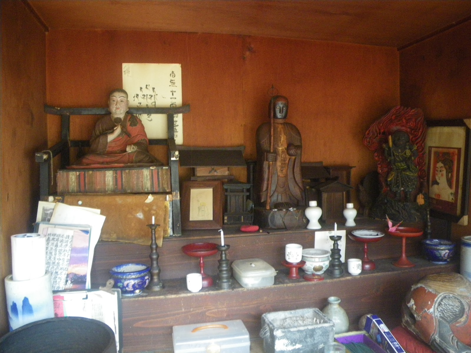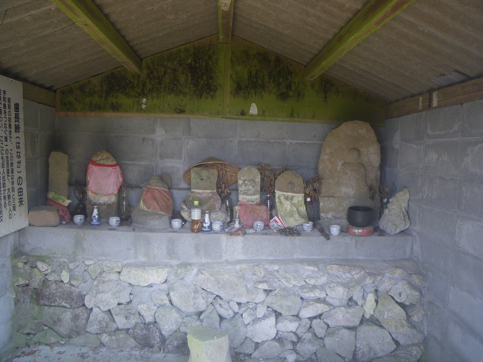 ブロック造りの祠に祀られる石仏にお参り。「えひめの記憶」によると、祠には見送大師が祀られると言う。