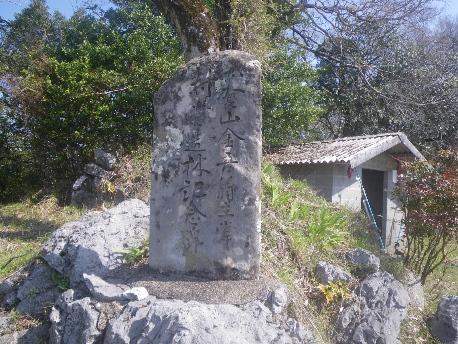 道崩壊箇所から先は等高線に沿ったり、また斜めに切り上がったりと、緩やかな道10分ほど上ると石組が見え、その先の平坦箇所がにブロック造りの社や石碑が建つ。そこが歯長峠であった。県道から分かれる土径から40分程度で高度を250mほど上げ、峠に着いた。