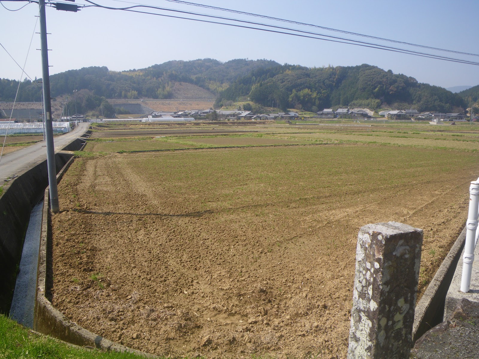 道を北に進み、車道が右に折れるところを直進し田圃の畦道を進み、しばらく歩き先ほど分かれた車道に合流。