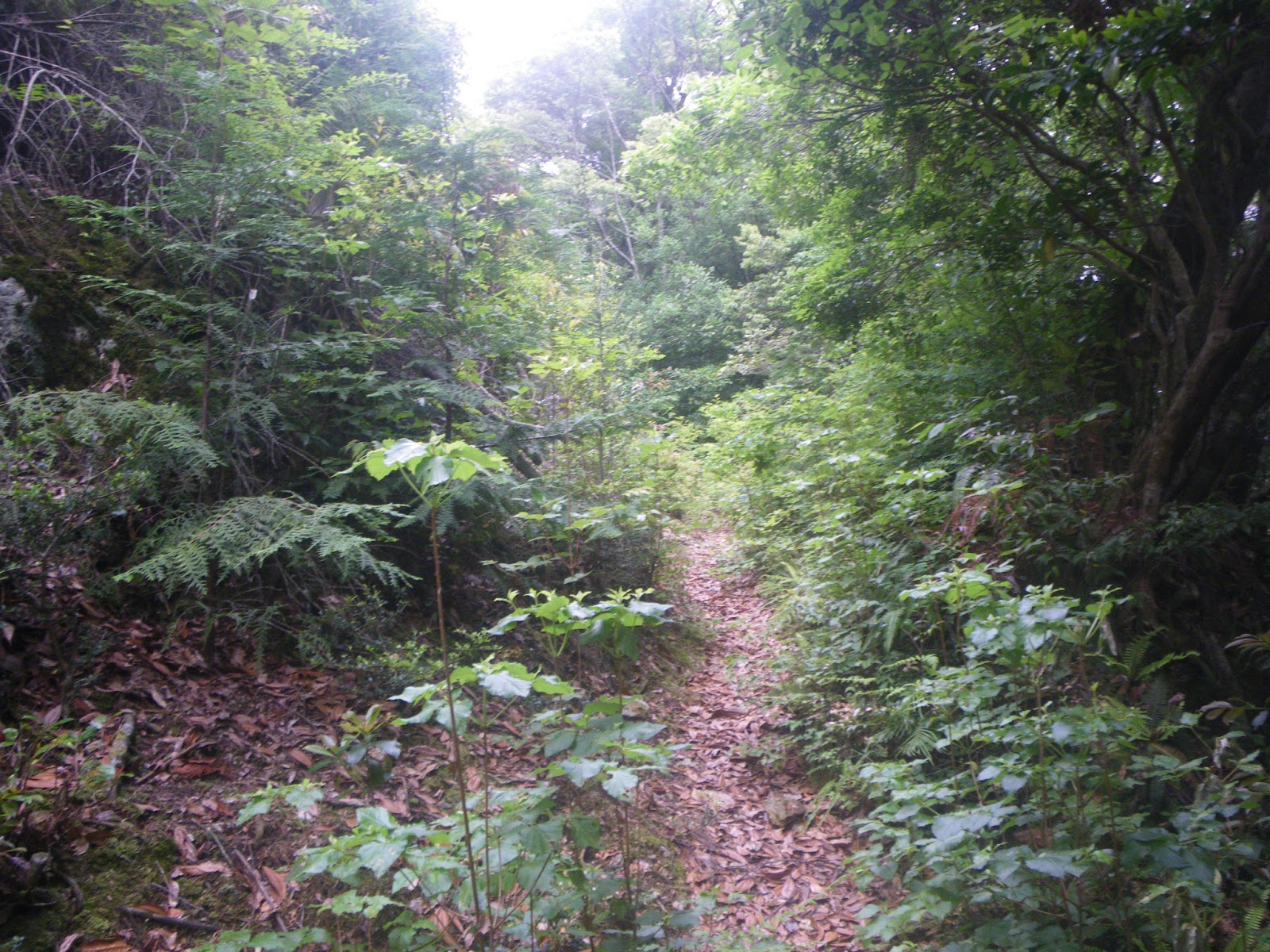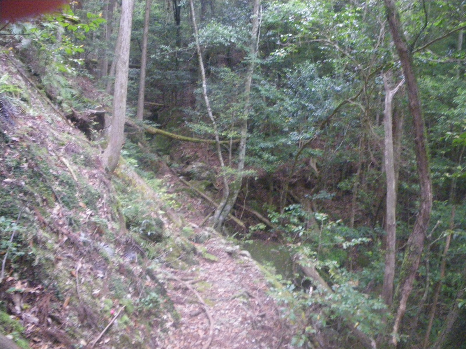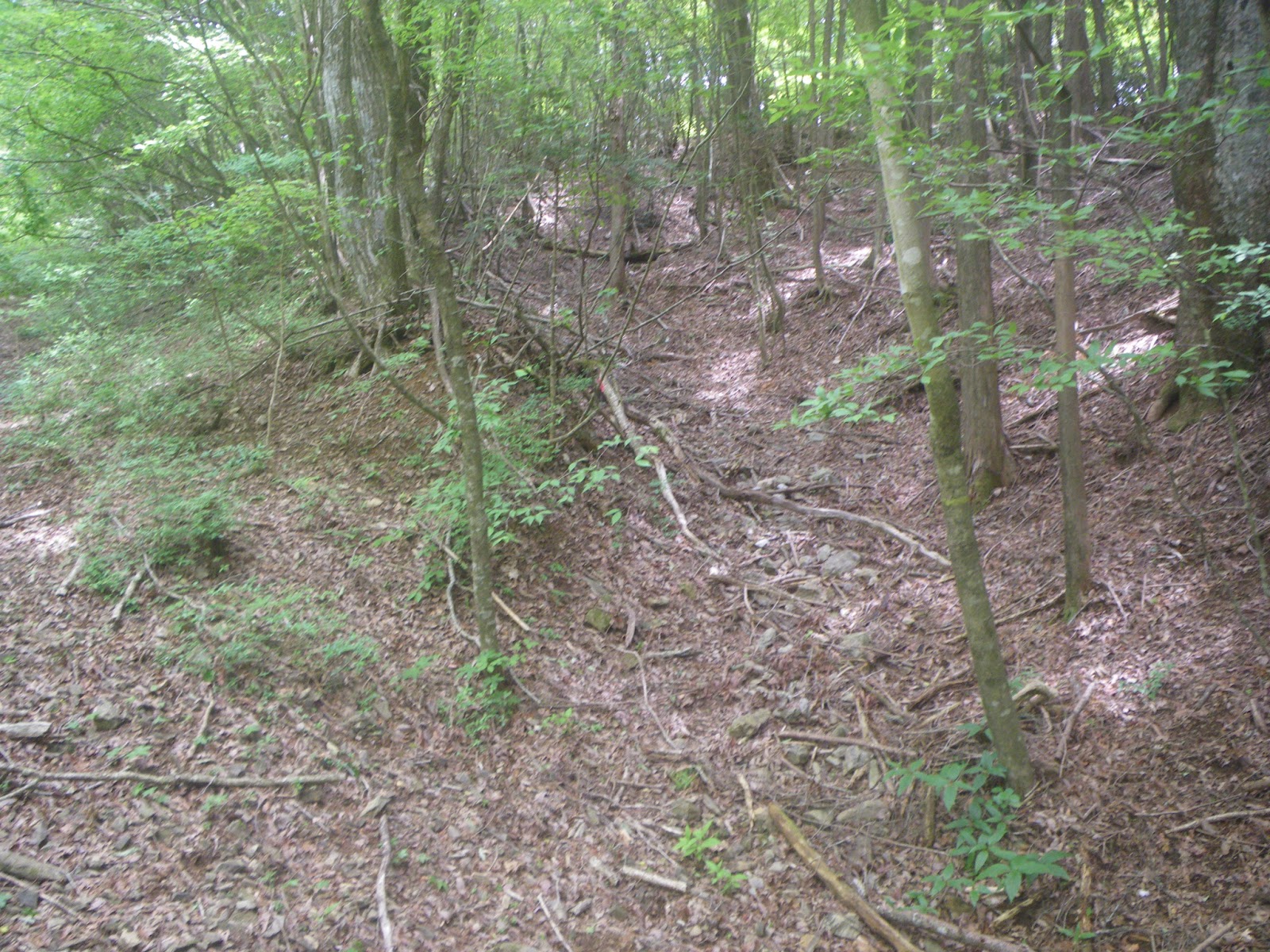 作業道を数分進み、道が左手に折れるところで作業道を逸れて坂を下りる踏まれた道がある。土佐街道はここで作業道から逸れて坂を下りる。標識も何もなく間違いやすいので注意が必要。