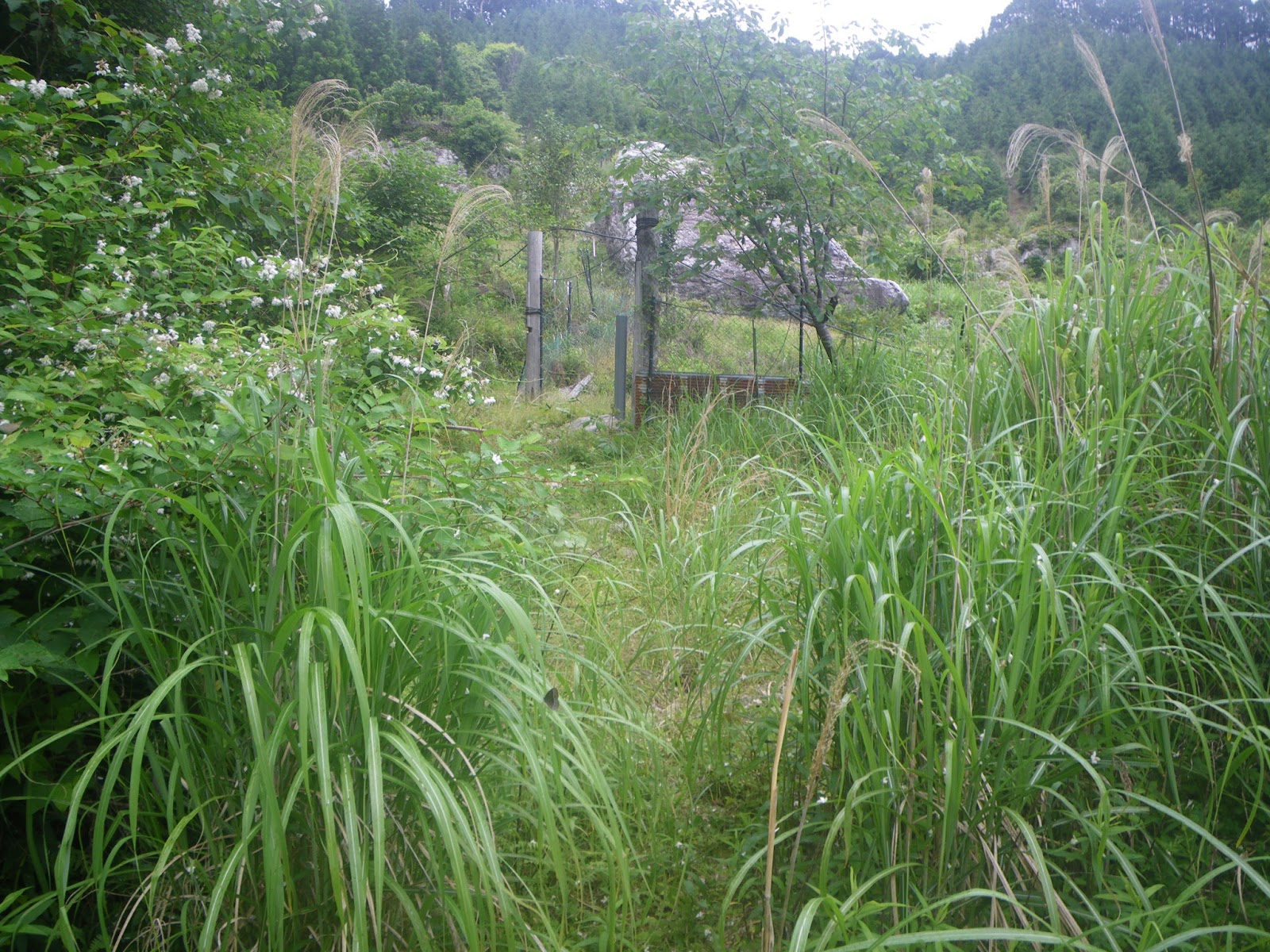 作業道を数分下り、作業道がふたつに分岐する箇所に6番目の開閉フェンスがある。ブッシュの道を進むと道の左手に田圃が見える。田圃をグルリと迂回して進む。