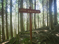 作業道(林道)に出ると、特に標識もリボンもないのだが、林道を越えて下る踏まれた道があり、そこを下る。結構荒れた道を10分ほど下ると「水の本」の標識。昔は冷水が湧きでており旅人の喉を潤したとのことだが、現在はその名残は何もない。大きく抉られ、荒れた沢筋といったものであった。