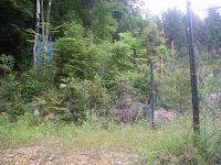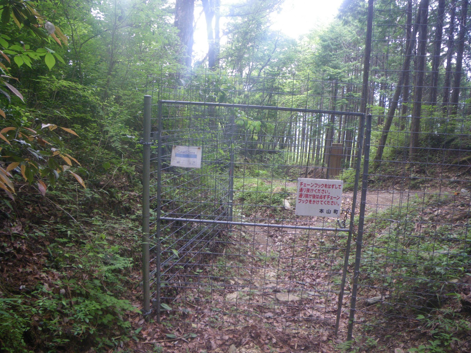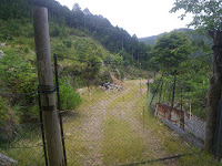 最初のフェンスから数分、20m弱下ると再びフェンスで道が塞がれる。フェンスの先には広い作業道が見える。チェーンを外し作業道に出る。