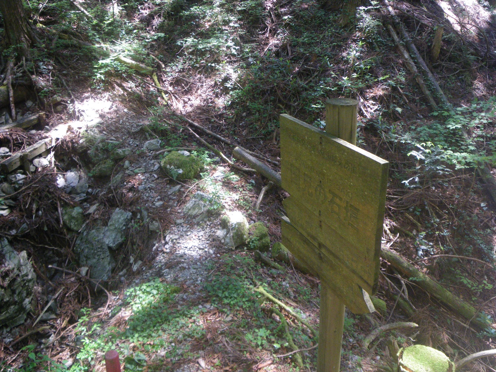 比較的広い作業道を500m等高線に沿って道を4分ほど進むと、T字路分岐点に当たる。コーナーには、土佐街道を示す坂本龍馬のイラストが括られた標識が立つ。標識に従い右に折れる。
