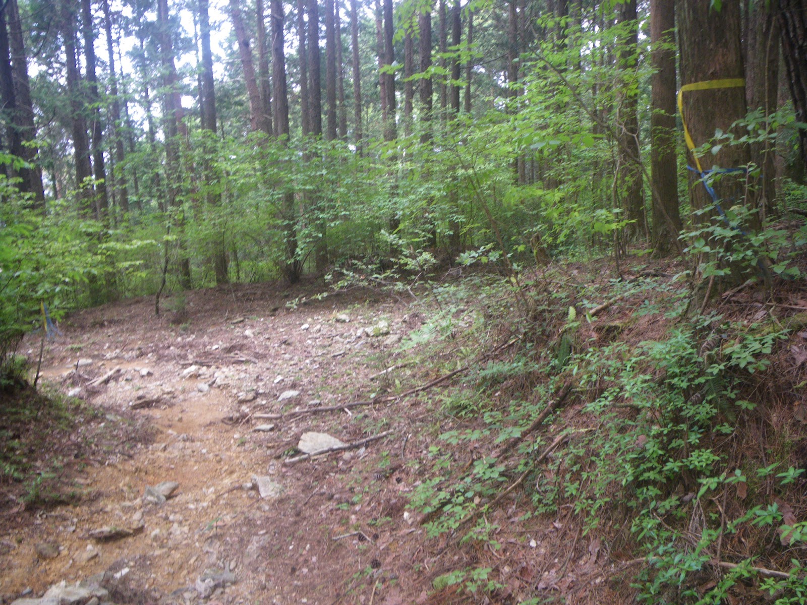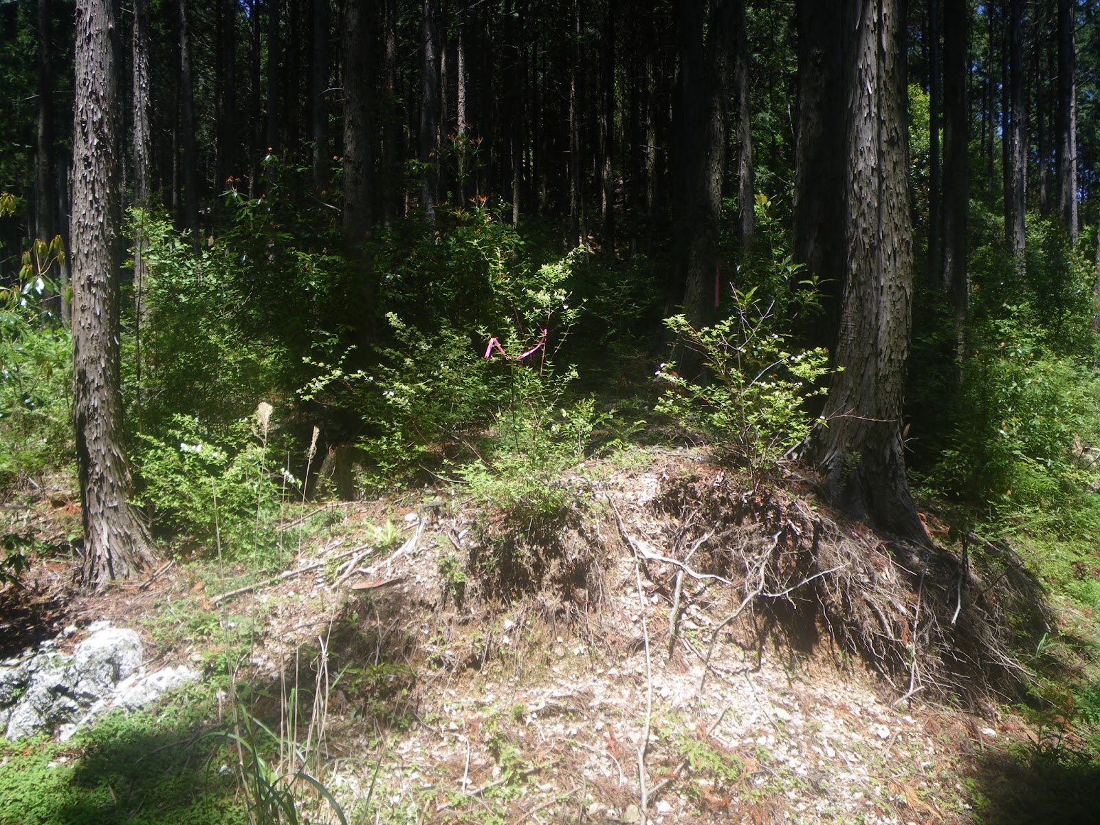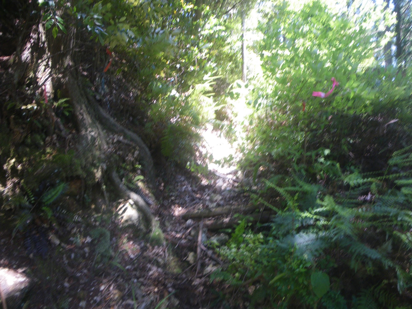 指示に従い林道を越え、これも少し荒れた道を下る。木に括られた黄色や青のリボンを目安に、小さめの作業道を越えて少し下ると、おおよそ10分ほどで比較的しっかりした作業道(林道)に出る。