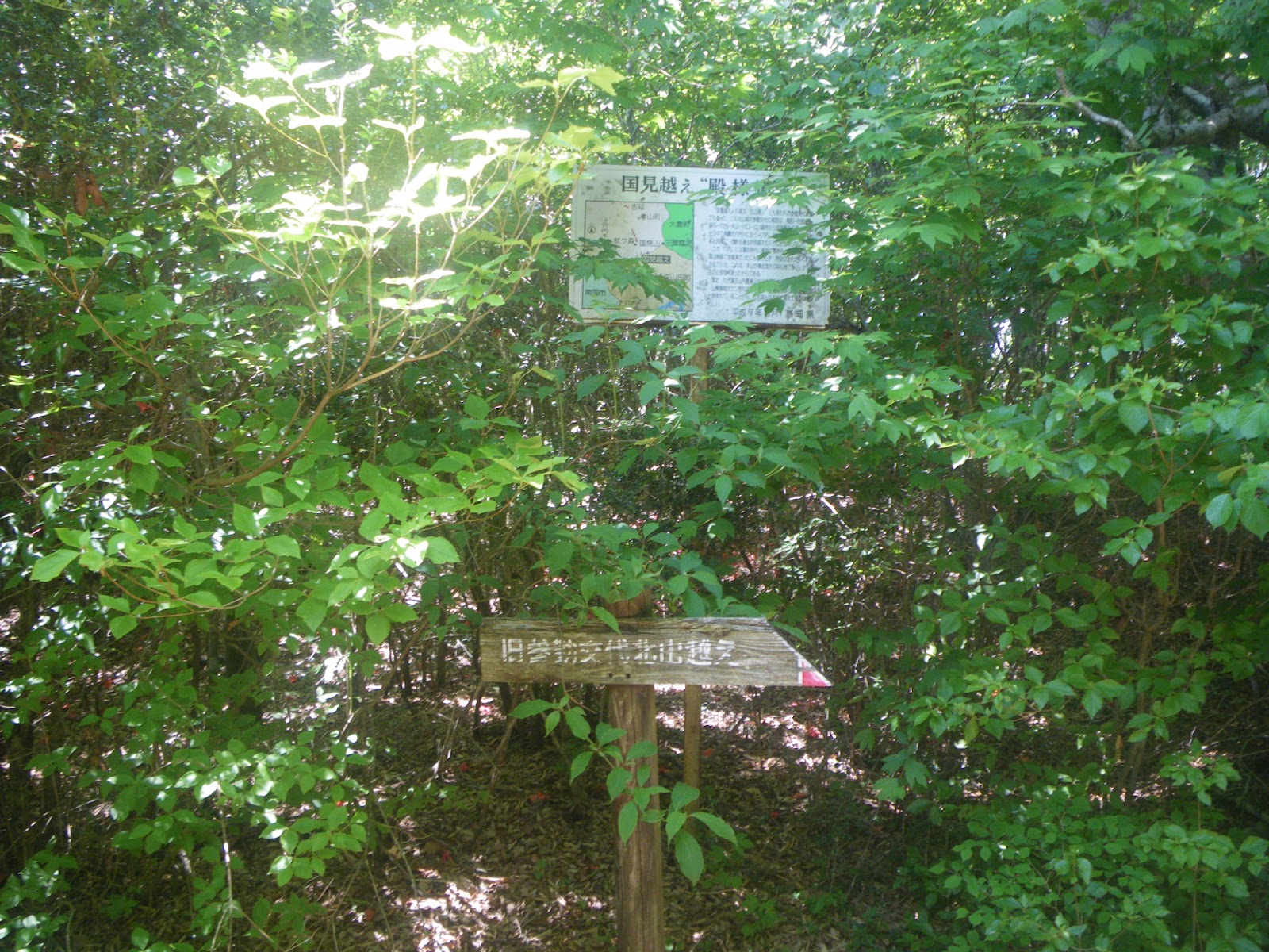 開閉フェンスの先の作業道を右に折れ、7分ほど進むとT字路に出る。T字路手前右角には「国見山」と書かれた標識。T字路突き当たり箇所には上り・下りの「参勤交代道」を指す標識が草に覆われて立っている。杖ヶ森の巻道にあった吉延への下山ルート標識からおおよそ3時間で下りた。当日の実際行動時間は9時57分にこの車デポ地を出発、15時3分にデポ地に戻った。おおよそ6時間のピストン行であった。