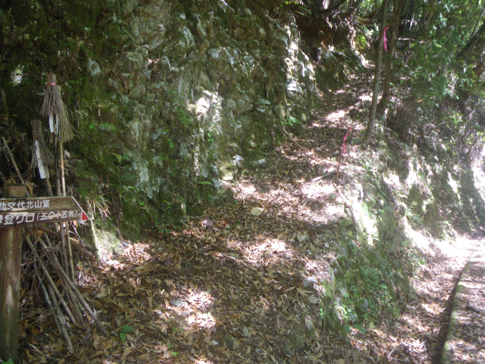 T字路となった林道を標識に従い北に進むと、道を進むと右手に「歴史の道 参勤交代北山道」の標識が立つ。道はこの標識から林道を離れ山道を下りる。