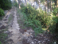 林道を数分進むと、林道左手に逸れる細い道があり小枝に赤いリボンが架っている。土佐街道の標識はないのだが、何となく気になり林道を逸れて左手に入る。倒木も多く、少し荒れた道を数分進むと、林道に出る。