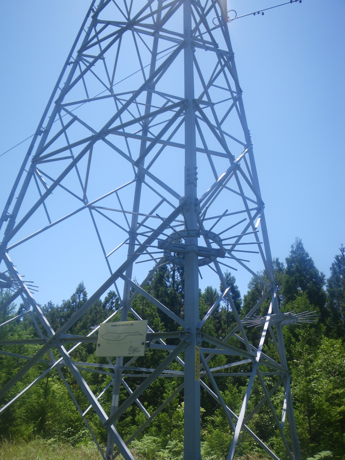 小振りな倒木が「敷かれた」山道を5分ほど進むと比較的広い道に出る。交差箇所には標識があり、下りてきた道と作業道を左に進む方向が指される。標識に従い左に折れて道を進む。ここまではおおよそ「国土地理院地図(新版)」に描かれた「破線」上を進んできたようだ。