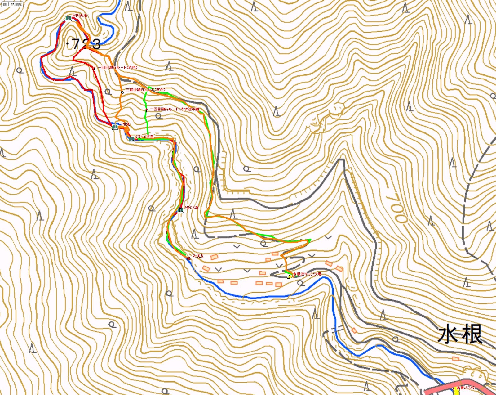 家に帰り地形図を見ると、沢を分けた尾根と思ったのは、水根沢にグンと突き出した尾根であり、単に水根沢が突き出した尾根の岩壁をぐるりと回っているだけであった。場所は最終地点である半円トイ状の少し下流といった箇所であった。この尾根筋のため少々混乱したが、もう少し高いところまで登れば林道に出合っていのかとも思う。水根沢のレポに林道探しに苦労した、といったものは皆無である。皆さんは何の苦労もなく林道に登れているのだろうか。