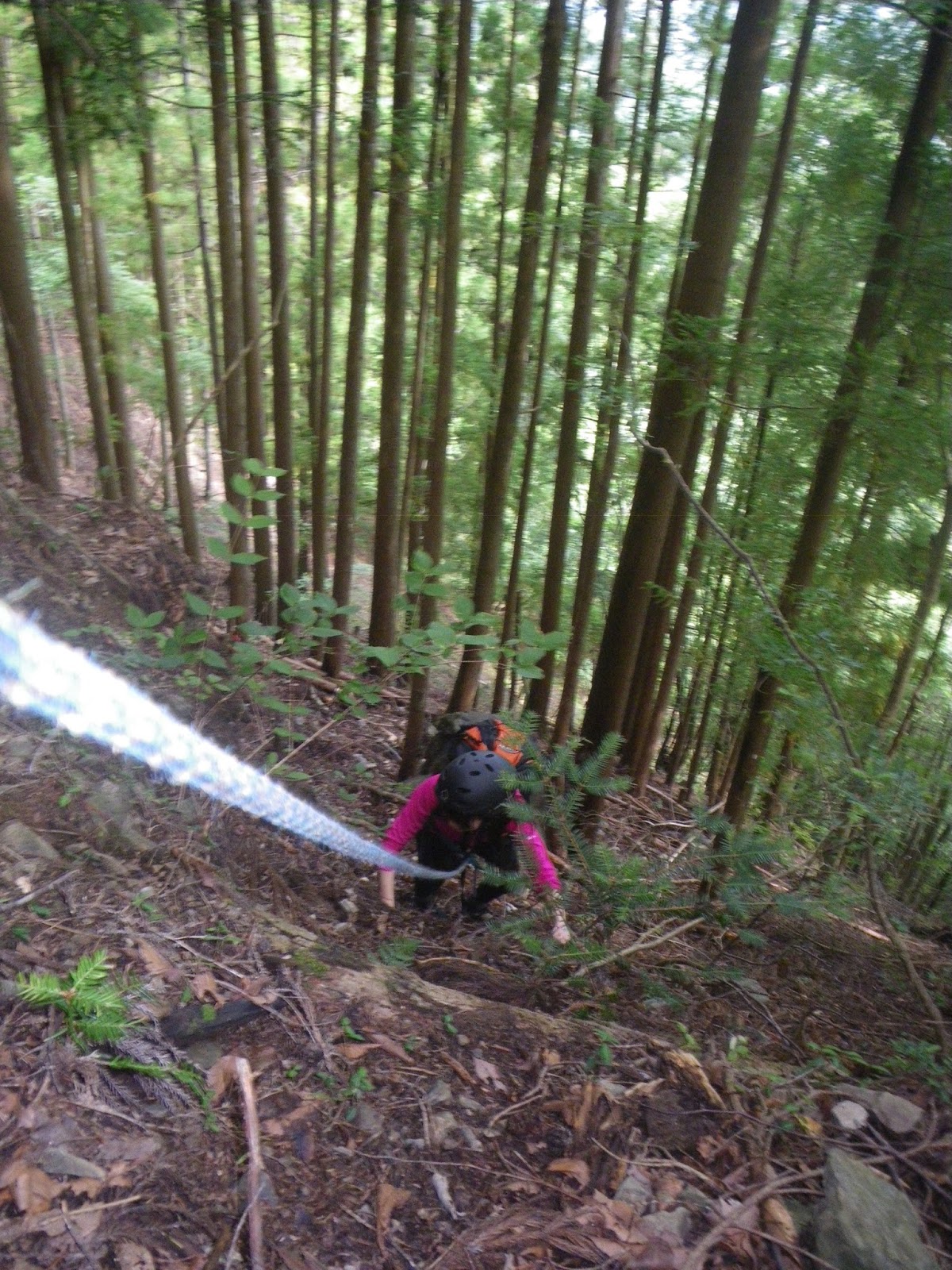 急登に難儀する沢ガールにはハーネスのカラビナにロープを結び、斜面の立木を支点に安全を確保しながら崖を這い上がる。結局は高巻き、というより登山道までエスケープした、といったほうがいいだろう。30分ほどかけて登山道に這い上がった。