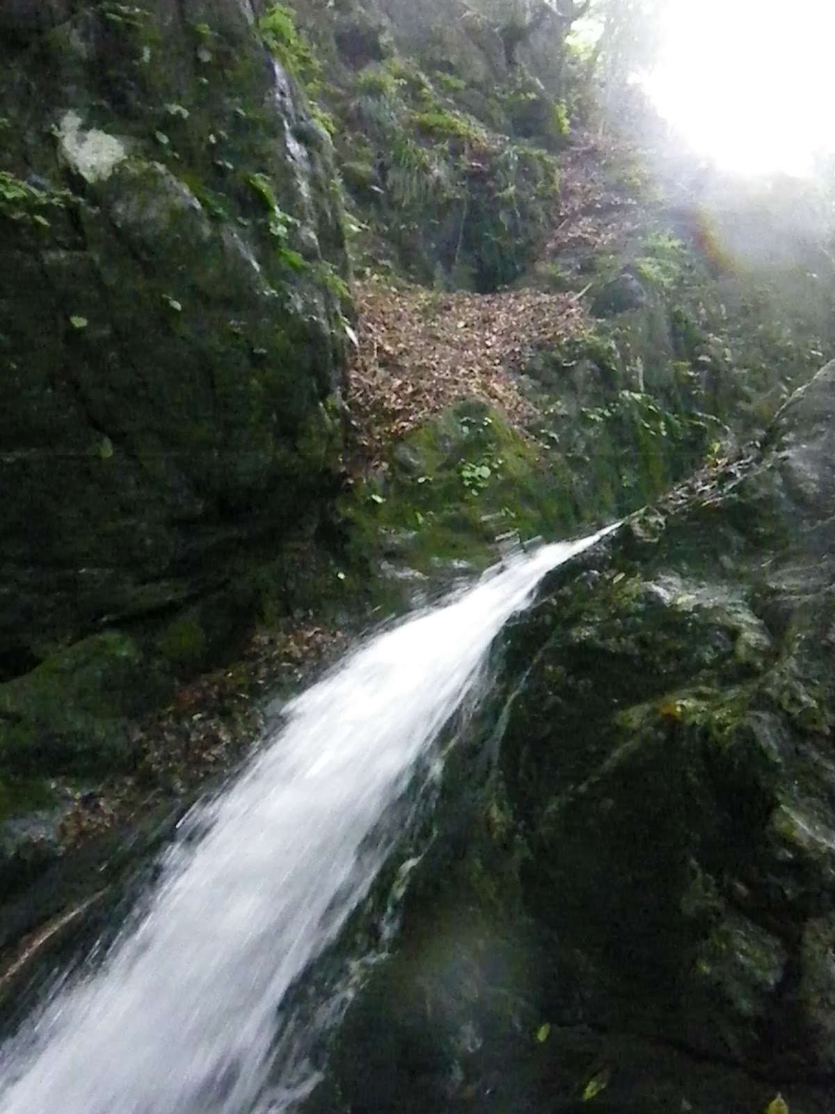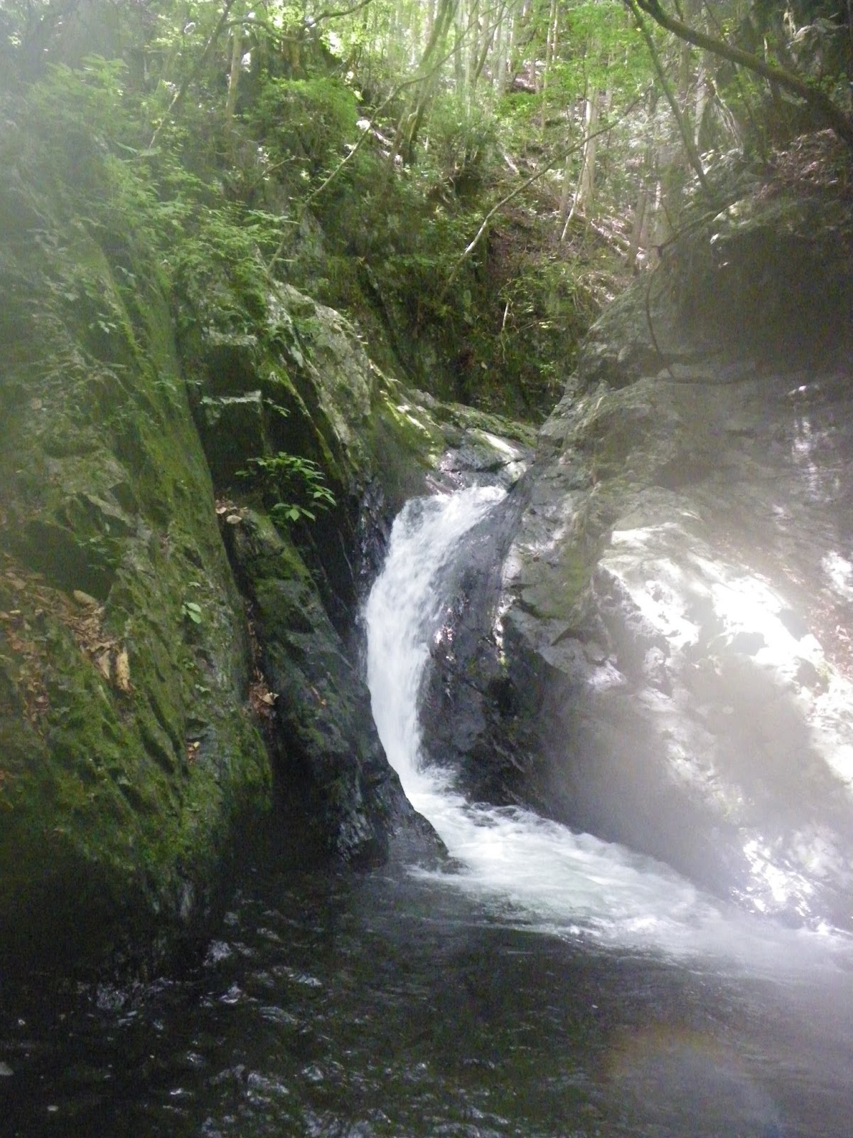 その先にトイ状の滝。雨水を集め下に流す樋(トイ)のように、狭い岩場を勢いよく水が流れ落ちる。ご一緒した方は、滝壺下まで進み、流れに抗いながらもステミング(両手両足で両側の岩場をホールドし滝を登る。蟹の横這い、といった格好である)でトイを突破するとのこと。