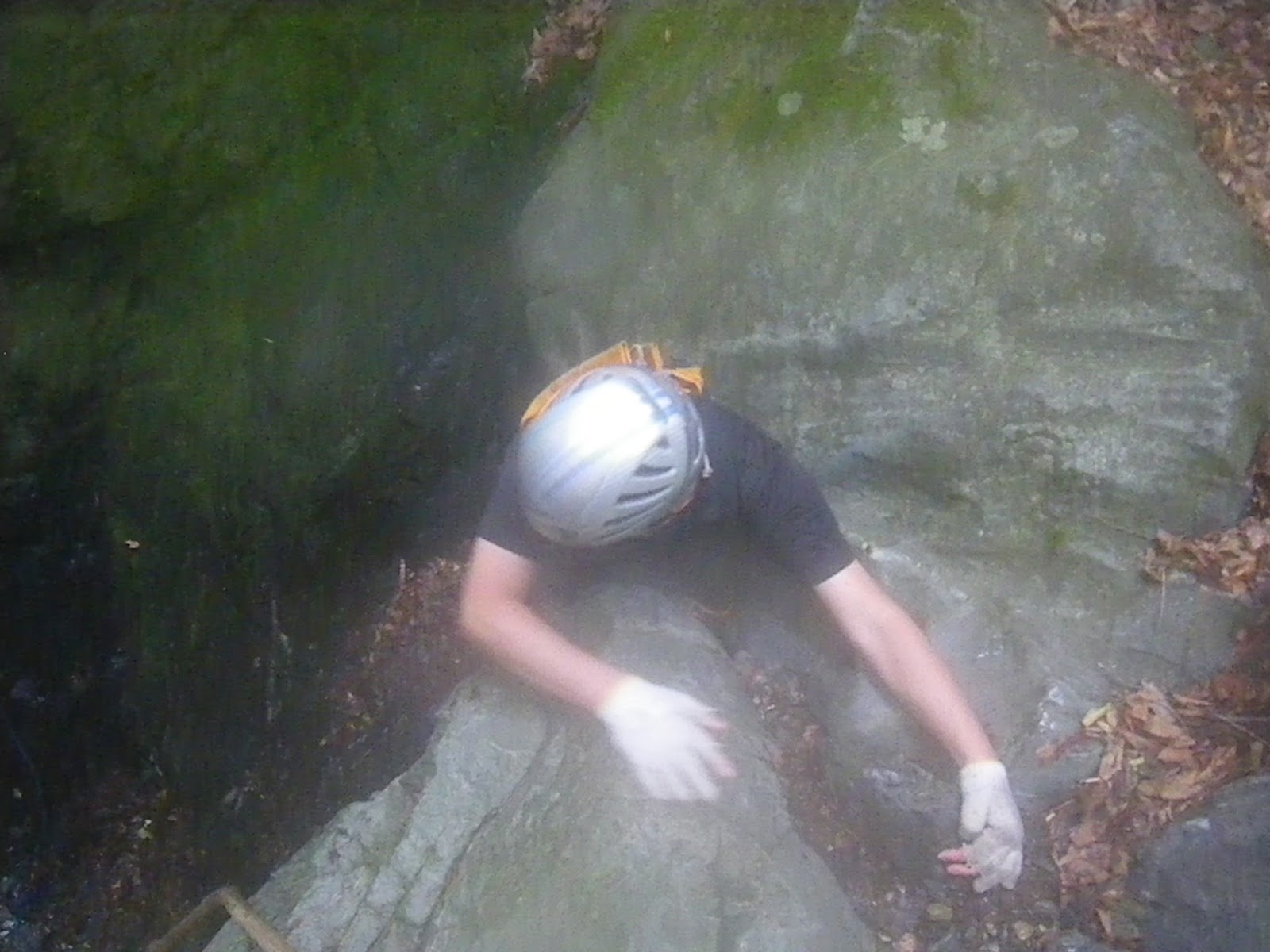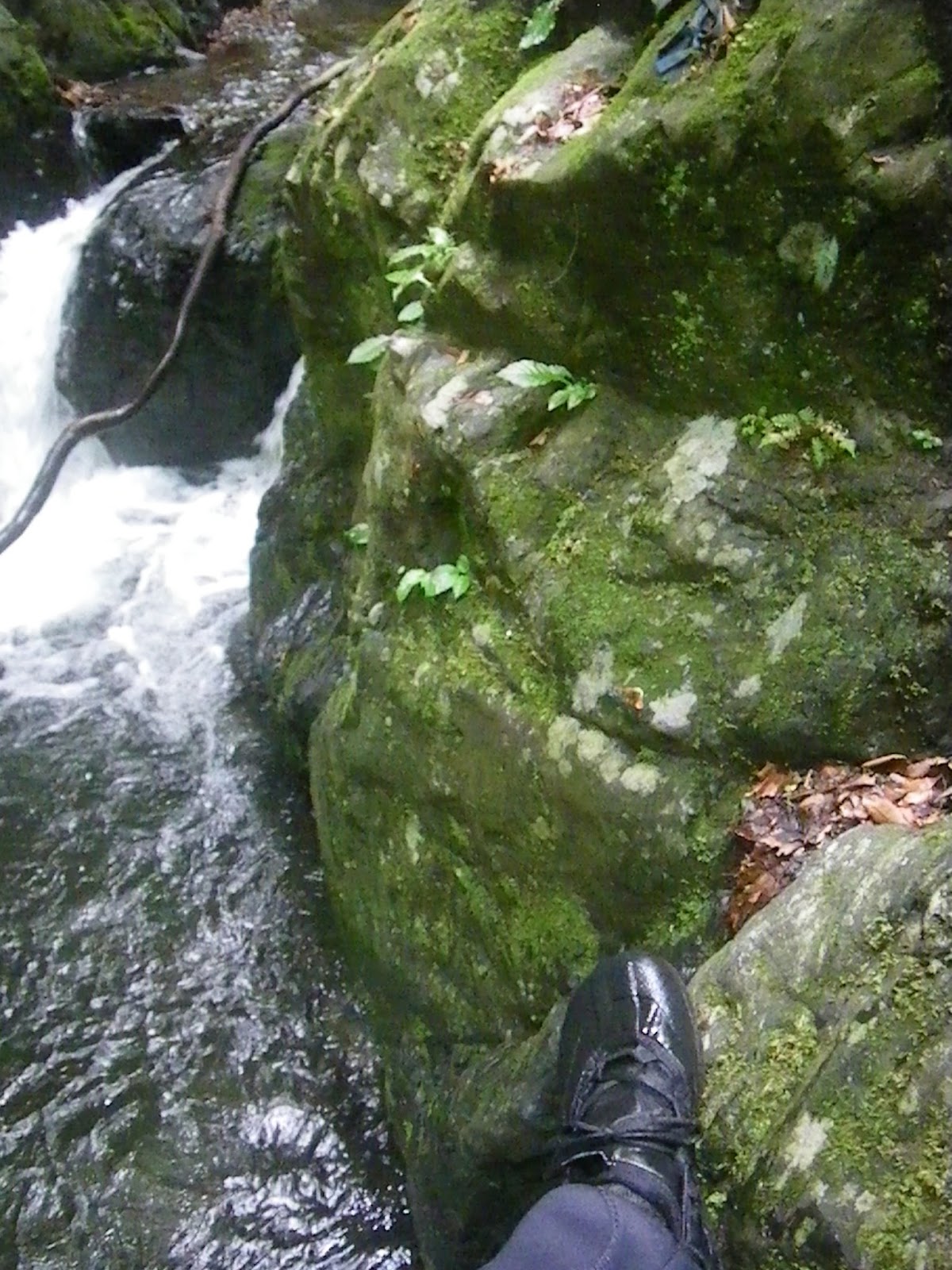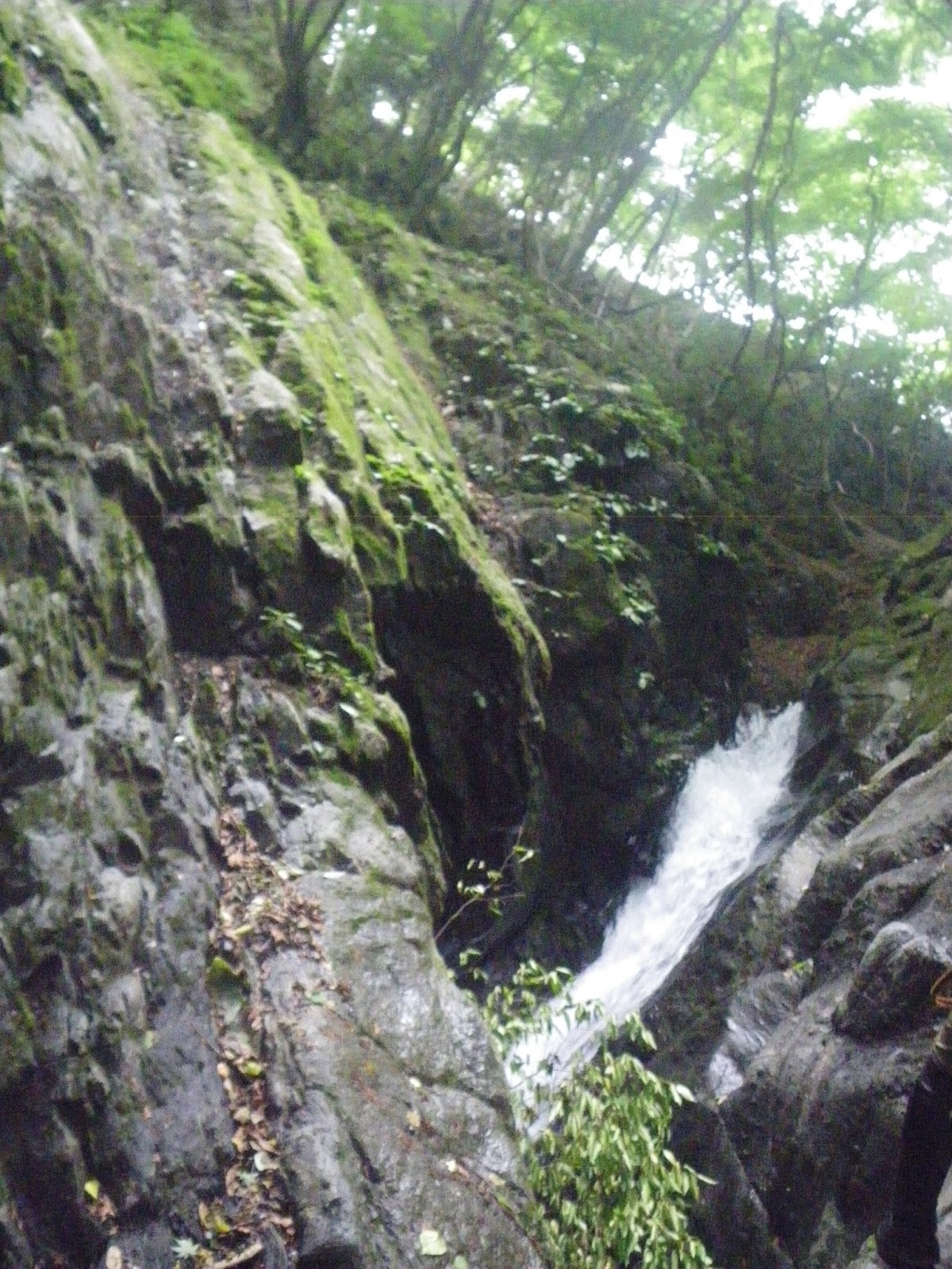 なんとか上の岩に這い上がろうと悪戦苦闘。水濡れを防ぐために着た雨具がつるつる滑り、岩場に張り付くもずり落ちる。結構苦労したがなんとか這い上がれた。多くの人は岩の右手の水流を上るようである。
