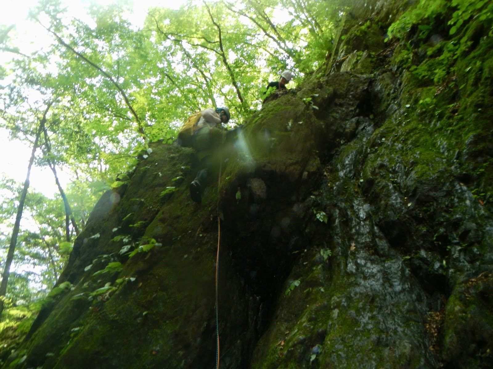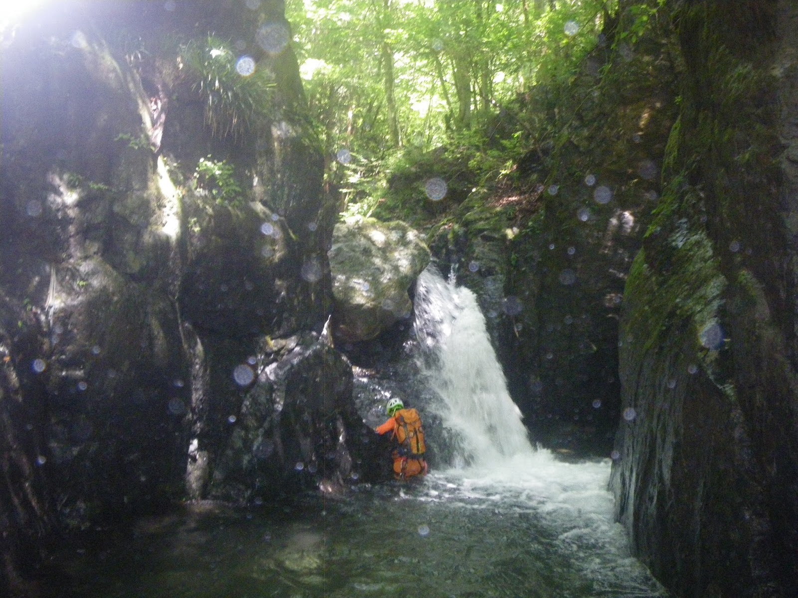 滝下まで泳ぎ、ステミングでトイ状の滝を登るもの、10m崖を懸垂下降で下るもの、また滝下まで泳ぎ、滝の水線から右岸の岩場にルートを見つけCSトイ状の滝をクリアする者と様々。各自の技量・好みに応じて3種類の選択肢がある。