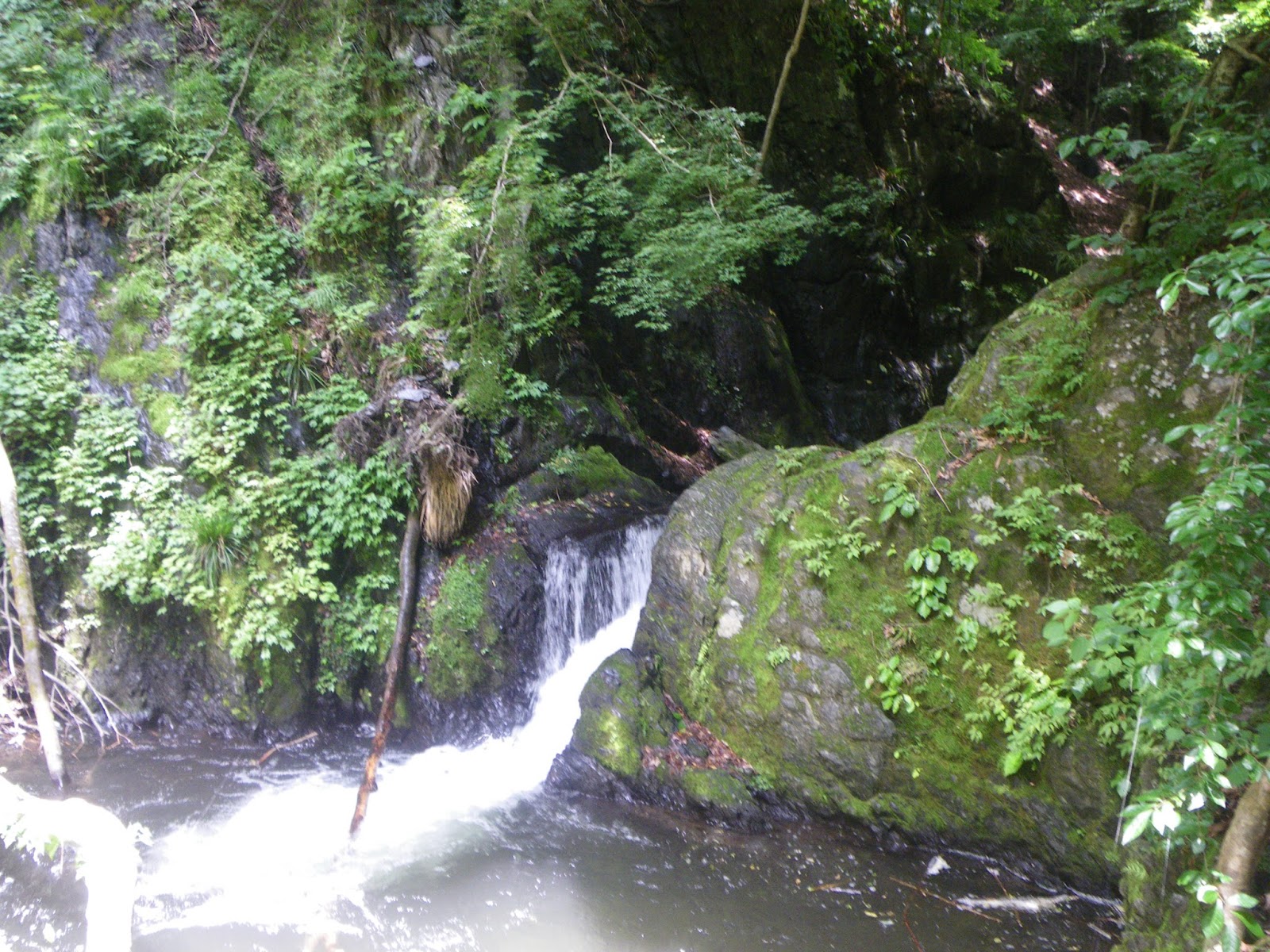 水に濡れるのを避けるため、極力高巻で、といった「計画」も下りのトイ状の滝での滝壺にドボンのため、結局全身ずぶ濡れになりながらも、なんとか入渓点まで戻る。そこはスタート時点では遠慮した民家前を通るアプローチ地点ではあった。