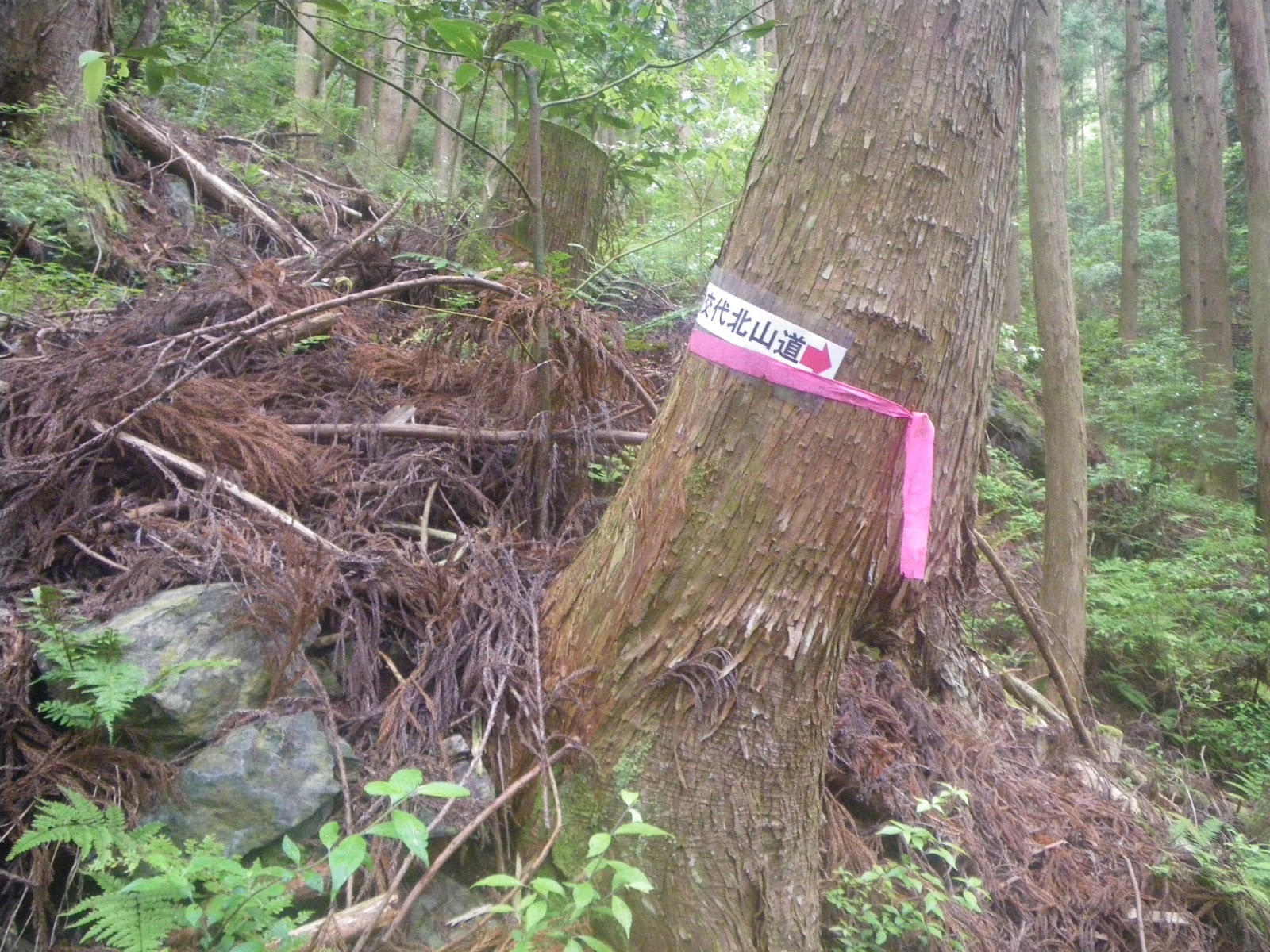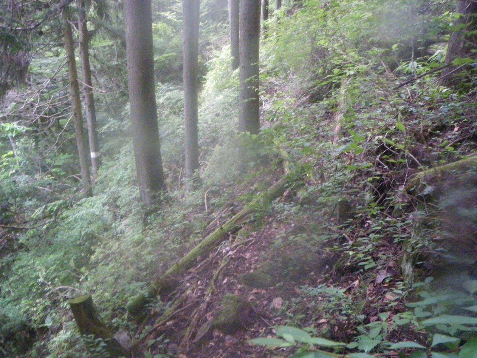 登山道を進むと、左手に支尾根が見える。道脇の過ぎに白のペンキが塗られていた箇所から支尾根に下りる道がある。支尾根への斜面を下り、平坦な支尾根上の踏み跡を進み、沢に下りる箇所を探す。