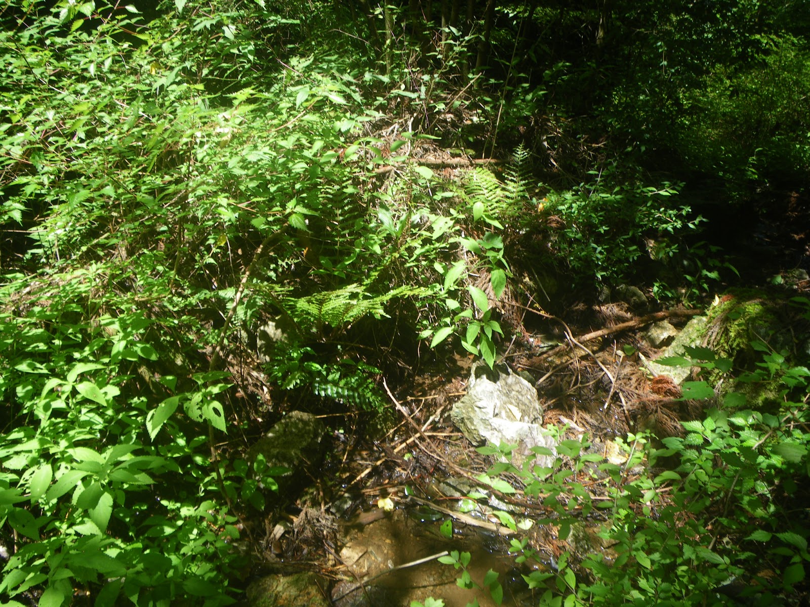 しばらく進むと舗装が切れ、山道に入る。これが水根沢登山道だろうか(後日登山道とは別の道であることが判明)。ほどなく、林道下に沢が見え、少々傾斜が急ではあるが、そこから沢に下りることにした。
