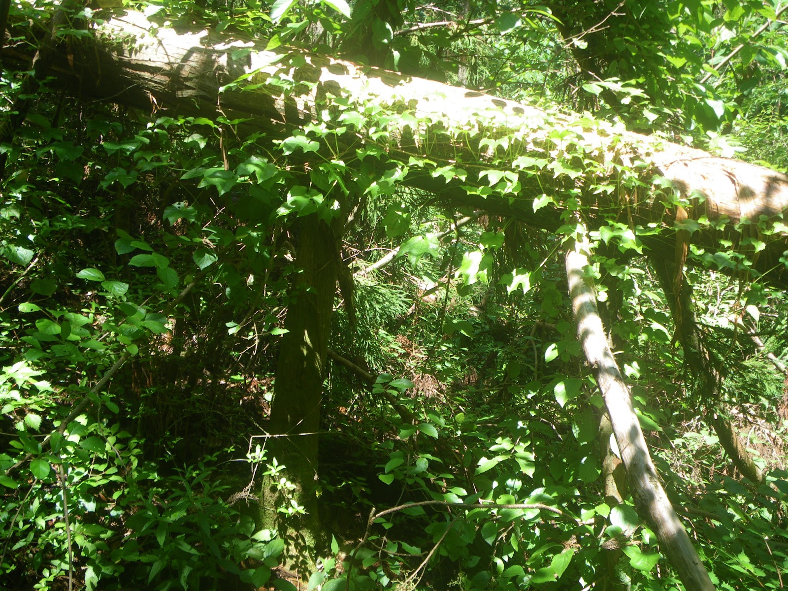 支尾根を進むと尾根筋を切り開いた箇所があり、そこから支尾根の右手を沢に下りる。これで半円の滝で終了した後の、登山道への道が繋がった。最初の沢入りで、登山道が見つからず沢を入渓点まで戻ったときは、この尾根の左手を成り行きで下り、トイ状滝の上にああttる2段12mの上に出たわけである。