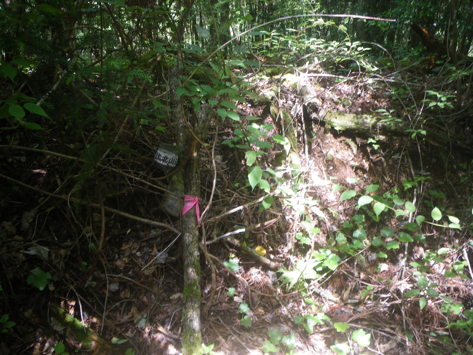 沢の左岸(というほどの沢でもないく、この辺りから水も消えるが)道を下ると「参勤交代 北山道」と書かれたプレートが木に巻き付けられている。その傍には赤と青のリボンもある。踏み跡らしき道を数分くだると次の標識に出合う。