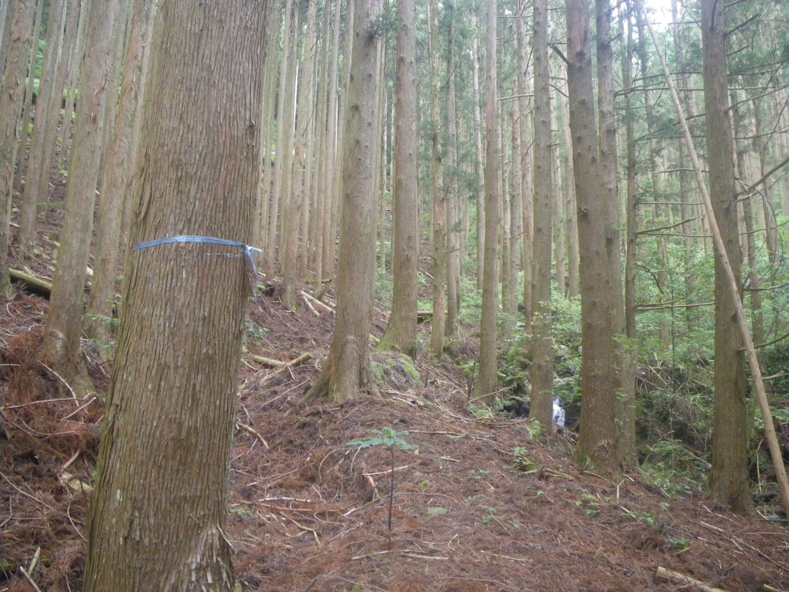 標識はあったのだが、足を踏み入れると直ぐに伐採で荒れた杉林の中。踏み跡もなく途方に暮れる。どうしたものかと、それらしき道筋を探していると杉に巻かれた青色のリボン(11時9分)が目に入った。このリボンが土佐北街道の案内かどうか不明であるが、とりあえずリボンの巻かれた杉の先へと進む。