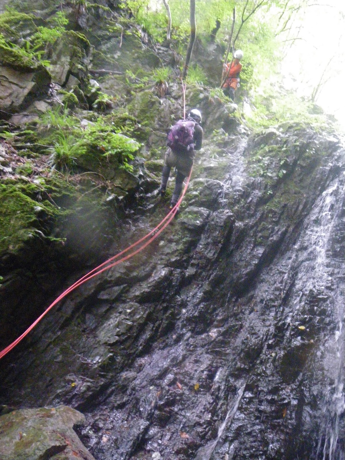 滝自体は5mなのだが、滝上に支柱になる立木がなく、滝の左手上にある立木にロープを回すと、滝の右岸に屹立する崖下まで?mのロープで丁度くらいの長さになった。 立木に結んだスリングとハーネスをカラビナで結び、セルフビレイで自身の安全確保をし、8環にロープを通し、崖下に落としたロープを右手で軽く握り、セルフビレイのスリングを外すように指示。