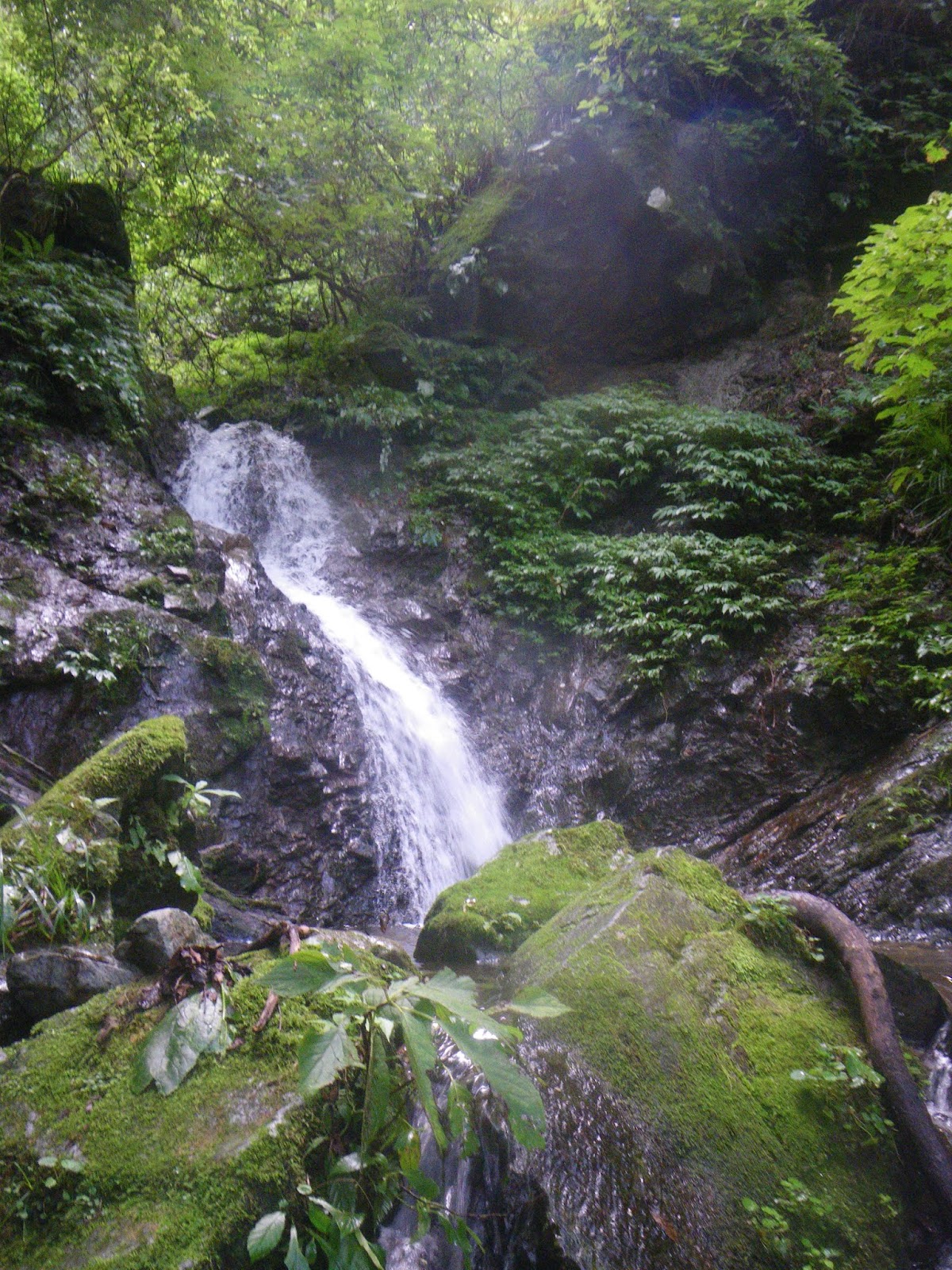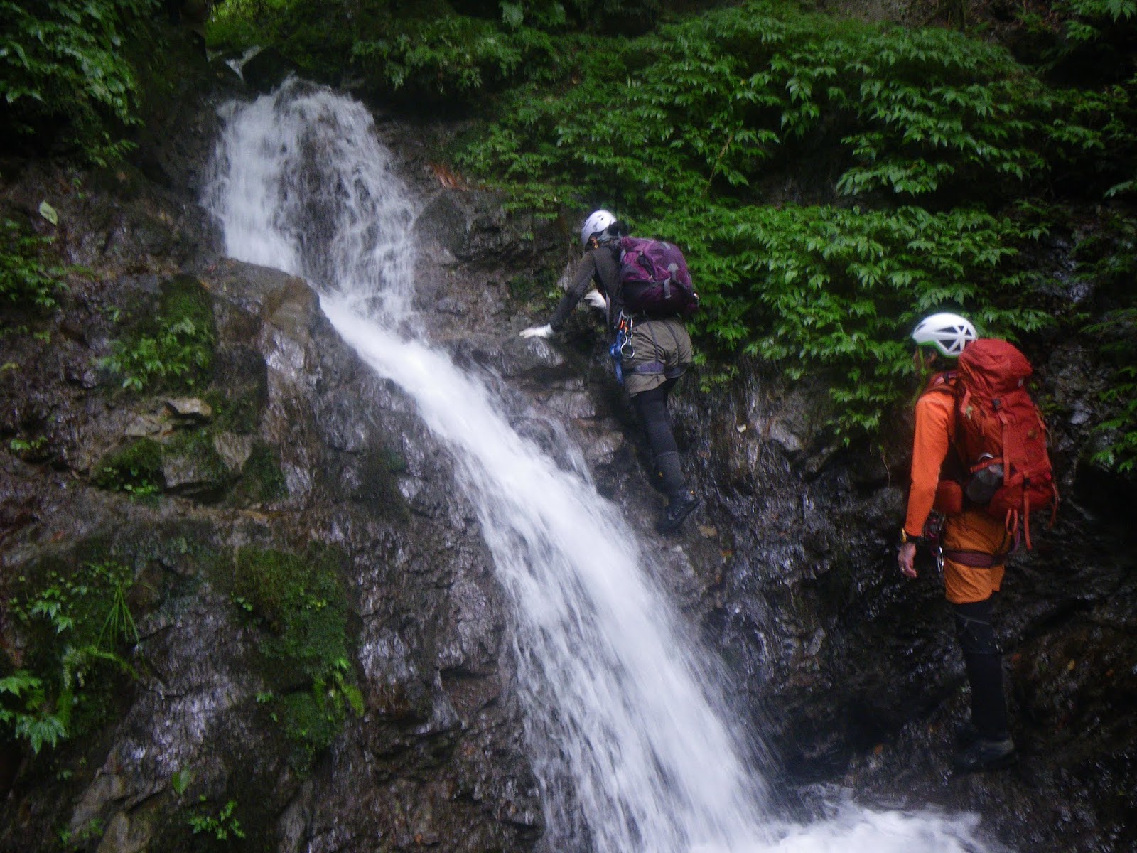 ついで本日の最終ポイントとした5mの滝。滝の左手の岩場は急ではあるが、適当なホールドがあり、岩場を這い上がることができた。S嬢には安全確保のロープを結び、岩場を上ってもらった。