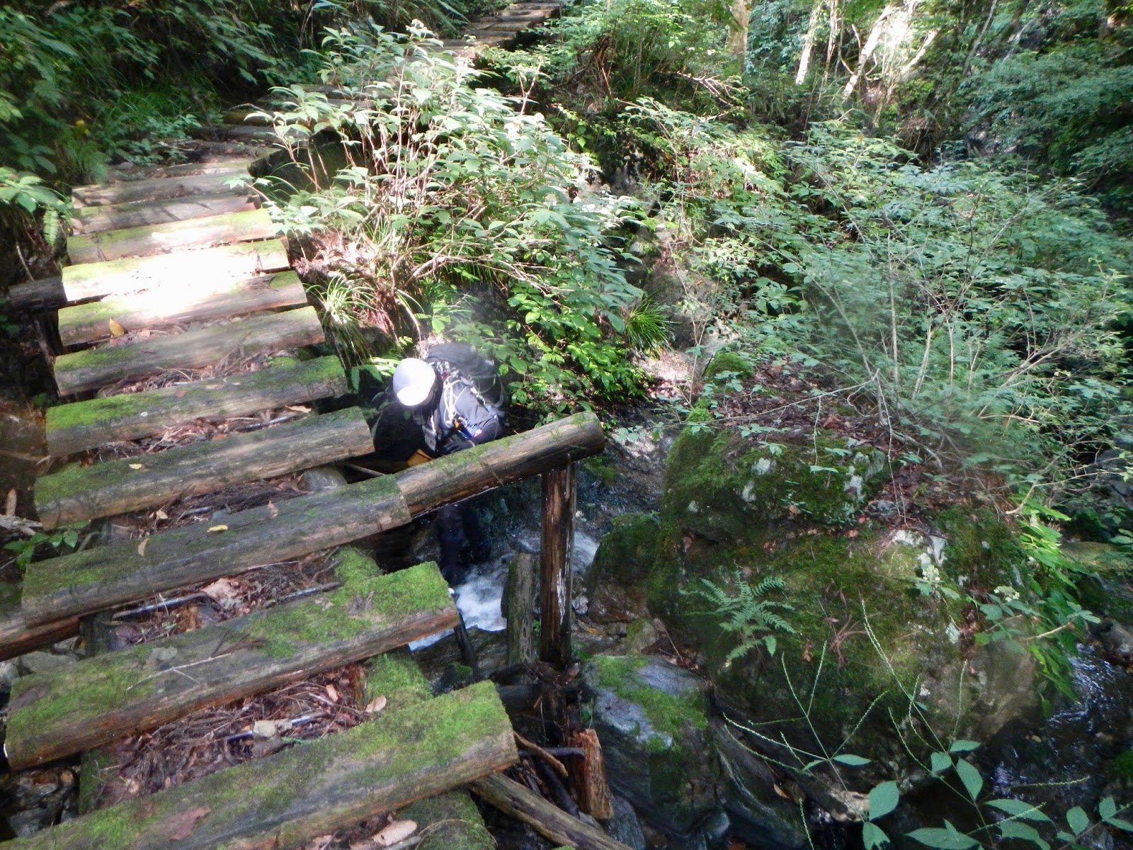 作業道を沢に下りるとすぐに最初の木橋がある。熊倉沢右俣からの流れを跨ぎ熊倉沢左俣の右岸に渡る。橋を渡るとほどなく熊倉沢左俣に架かる木橋があり右岸渡る。熊倉沢林道から見えて木橋がこれだろう。木橋は雨の翌日でもあり滑りやすく、慎重に歩を進める。