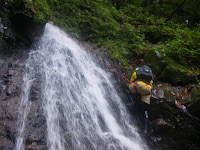 5m滝の懸垂下降が10m以上の垂直な崖を下りることになったため、急斜面ではあるが所詮斜面ということで、懸垂下降はじめてのふたりも軽く舞い降りた。