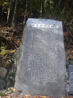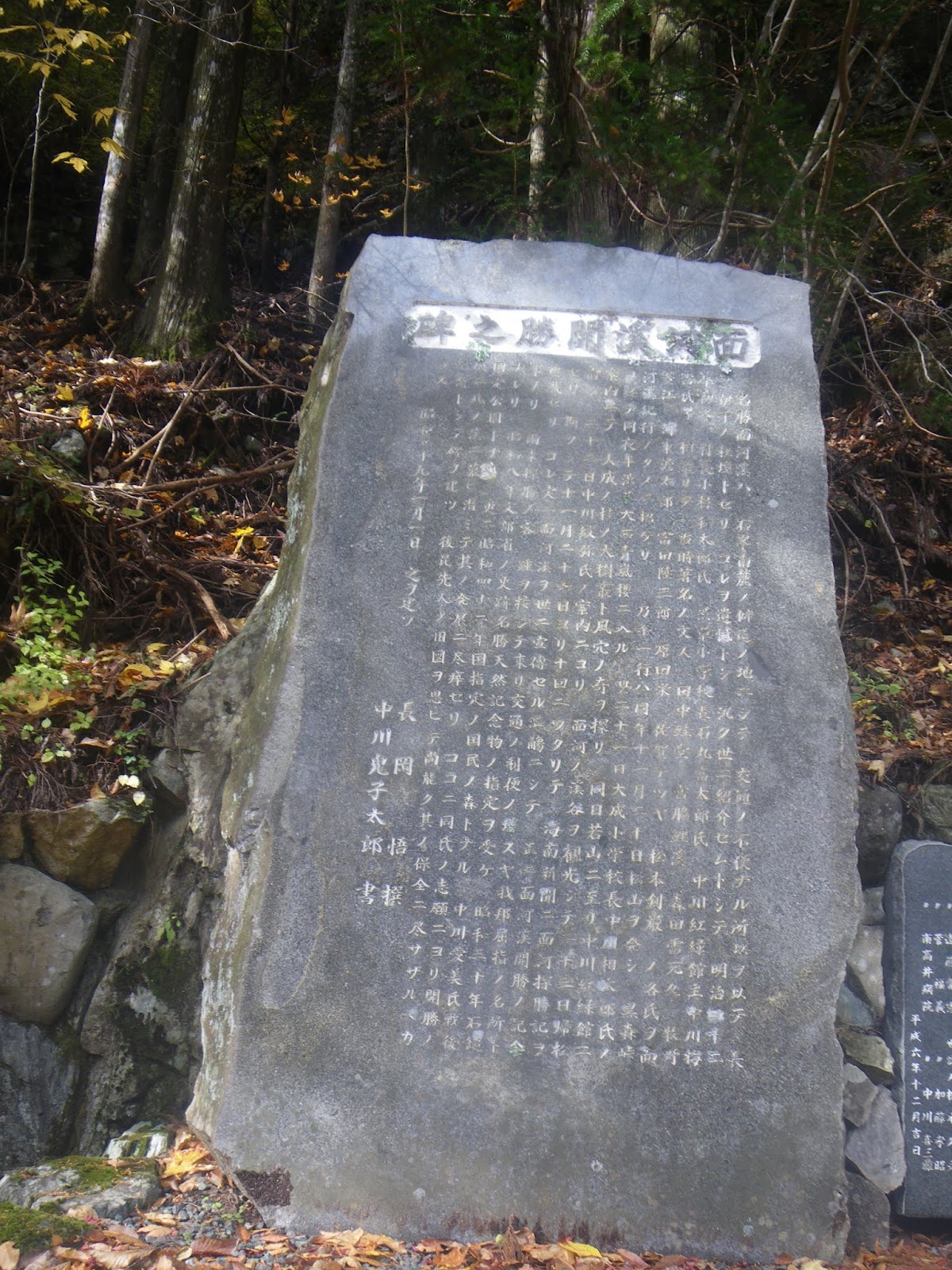 三つの隧道を抜けた先、道の山側に石碑が立つ。面河渓開勝の碑とあり、明治43年(1910)の面河渓探勝団の事績が刻まれていた。『海南新聞(後の愛媛新聞)』の後援のもと、詩人・画家・登山家・写真家からなる9名の踏査団がこの地を訪れ、その後十数回に渡り海南新聞紙上で面河の魅力を伝えた。これにより面河が世に知られるようになったと言う。