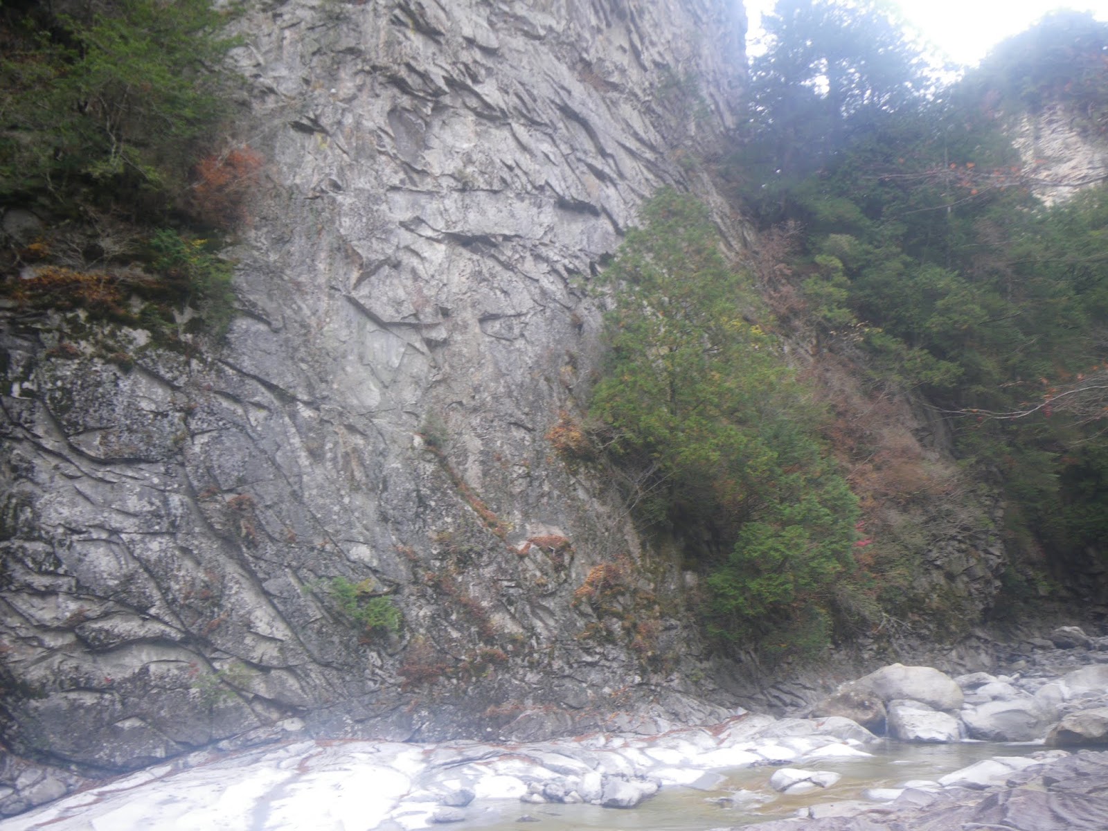 どこが紅葉石か不明だが、取敢えず撮った写真が紅葉石のある辺りだったようだ。「えひめの記憶」に「このあたり一帯は白色の岩石でこれにカエデの葉のように集まった黒色電気石の結晶が明りょうに現れている。それぞれ一葉の長さが一〇センチ内外で数一〇〇個ずつ二か所にあり」とある楓の葉のような結晶らしき斑点が、岩壁に着生した草木の手前に見える。それが紅葉石だろうか。学術的には非常に貴重な岩と言う。