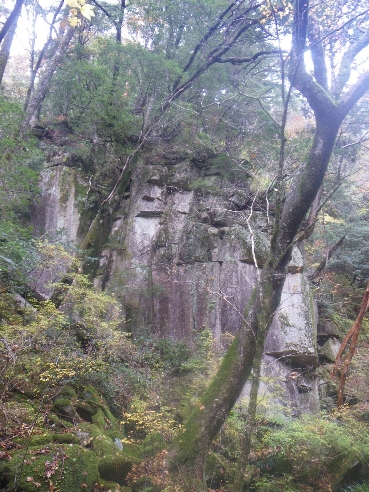 遊歩道を進む。道の左手の山塊には発達した節理を持つ大岩が続く。見飽きることがない。メモの段階であらためて写真を見ると、山塊の岩層は凝灰岩と言うより花崗岩のような気がしてきた。と言うことは亀腹もその岩層は花崗岩である、ということになりそうだ。